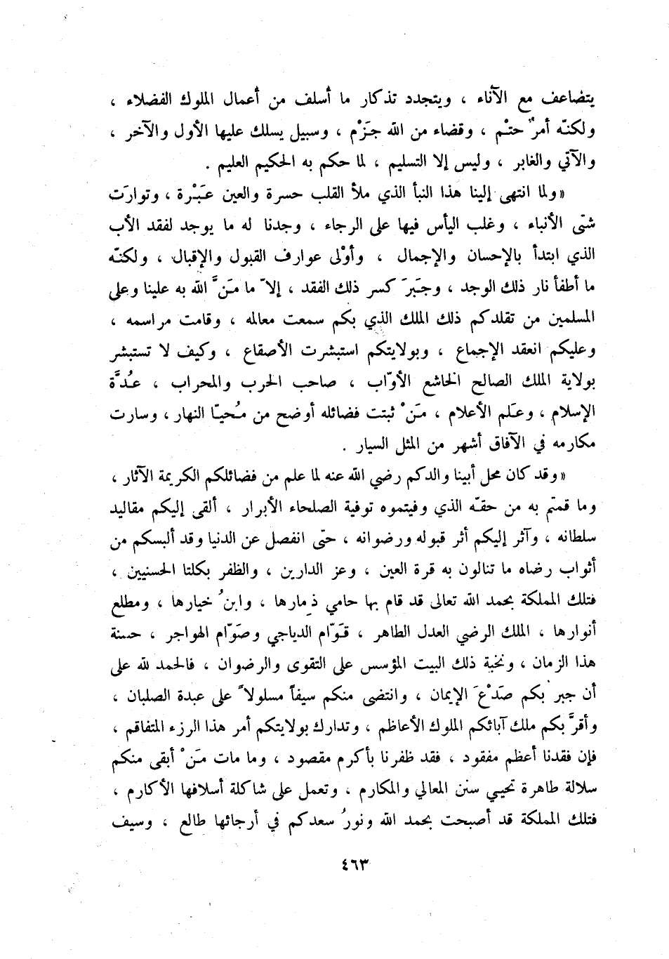 ولما انتهى إلينا هذا النبأ الذي ملأ القلب حسرة والعين عبرة، وتوارت شتى الأنباء، وغلب اليأس فيها على الرجاء، وجدنا له ما يوجد لفقد الأب الذي ابتدأ بالإحسان والإجمال، وأولى عوارف القبول والإقبال، ولكنه ما أطفأ نار ذلك الوجد، وجبر كسر ذلك الفقد، إلا ما من الله به علينا وعلى المسلمين من تقلدكم ذلك الملك الذي بكم سمعت معالمه، وقامت مراسمه، وعليكم انعقد الإجماع، وبولايتكم استبشرت الأصقاع، وكيف لا تستبشر بولاية الملك الصالح الخاشع الأواب، صاحب الحرب والمحراب، عدة الإسلام، وعلم الأعلام، من ثبتت فضائله أوضح من محيا النهار، وسارت مكارمه في الآفاق أشهر من المثل السيار.
