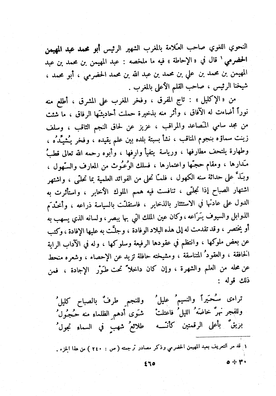 النحوي اللغوي صاحب العلامة بالمغرب الشهير الرئيس أبو محمد عبد المهيمن الحضرمي (1) قال في " الإحاطة " فيه ما ملخصه: عبد المهيمن بن محمد بن عبد المهيمن بن محمد بن علي بن محمد بن عبد الله بن محمد الحضرمي، أبو محمد، شيخنا الرئيس، صاحب القلم الأعلى بالمغرب.