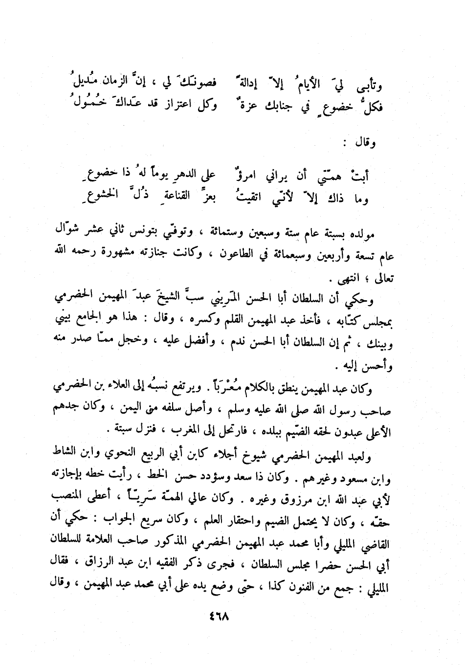 ولعبد المهيمن الحضرمي شيخ أجلاء كابن أبي الربيع النحوي وابن الشاط وابن مسعود وغيرهم. وكان ذا سعد وسؤدد حسن الحظ، رأيت خطه بإجازته لأبي عبد الله ابن مرزوق وغيره. وكان عالي الهمة سرياً، أعطى المنصب حقه، وكان لا يحتمل الضيم واحتقار العلم، وكان سريع الجواب: حكي أن القاضي المليلي وأبا محمد عبد المهيمن الحضرمي المذكور صاحب العلامة للسلطان أبي الحسن حضرا مجلس السلطان، فجرى ذكر الفقيه ابن عبد الله الرزاق، فقال المليلي: جمع من الفنون كذا، حتى وضع يده على أبي محمد عبد المهيمن، وقال