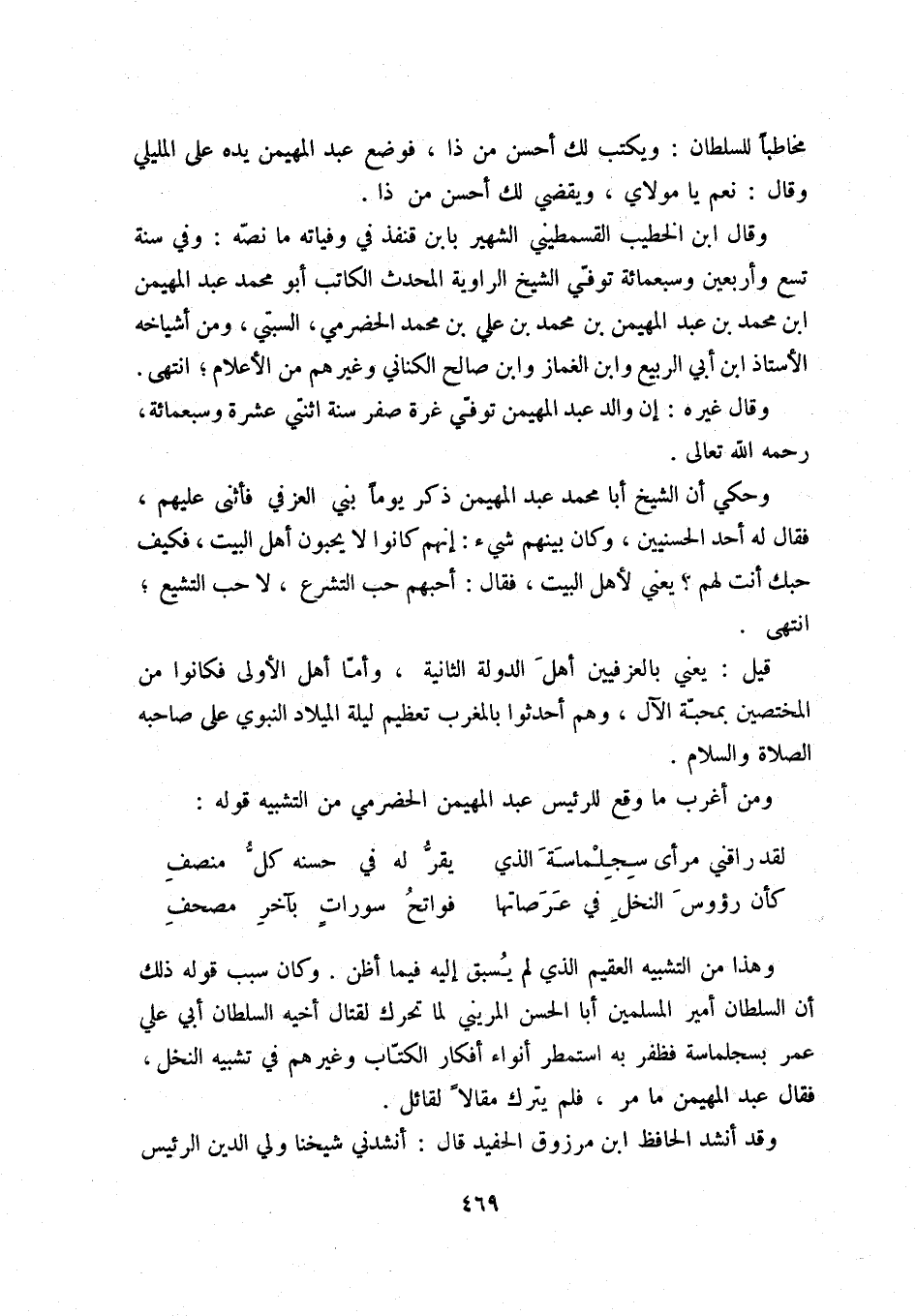 كأن رؤوس النخل في عرصاتها ... فواتح سورات بآخر مصحف وهذا من التشبيه العقيم الذي لم يسبق إليه فيما أظن. وكان سبب قوله ذلك أن السلطان أمير المسلمين أبا الحسن المريني لما تحرك لقتال أخيه السلطان أبي علي عمر بسجلماسة فظفر بها استمطر أنواء أفكار الكتاب وغيرهم في تشبيه النخل، فقال عبد المهيمن ما مر، فلم يترك مقالاً لقائل.