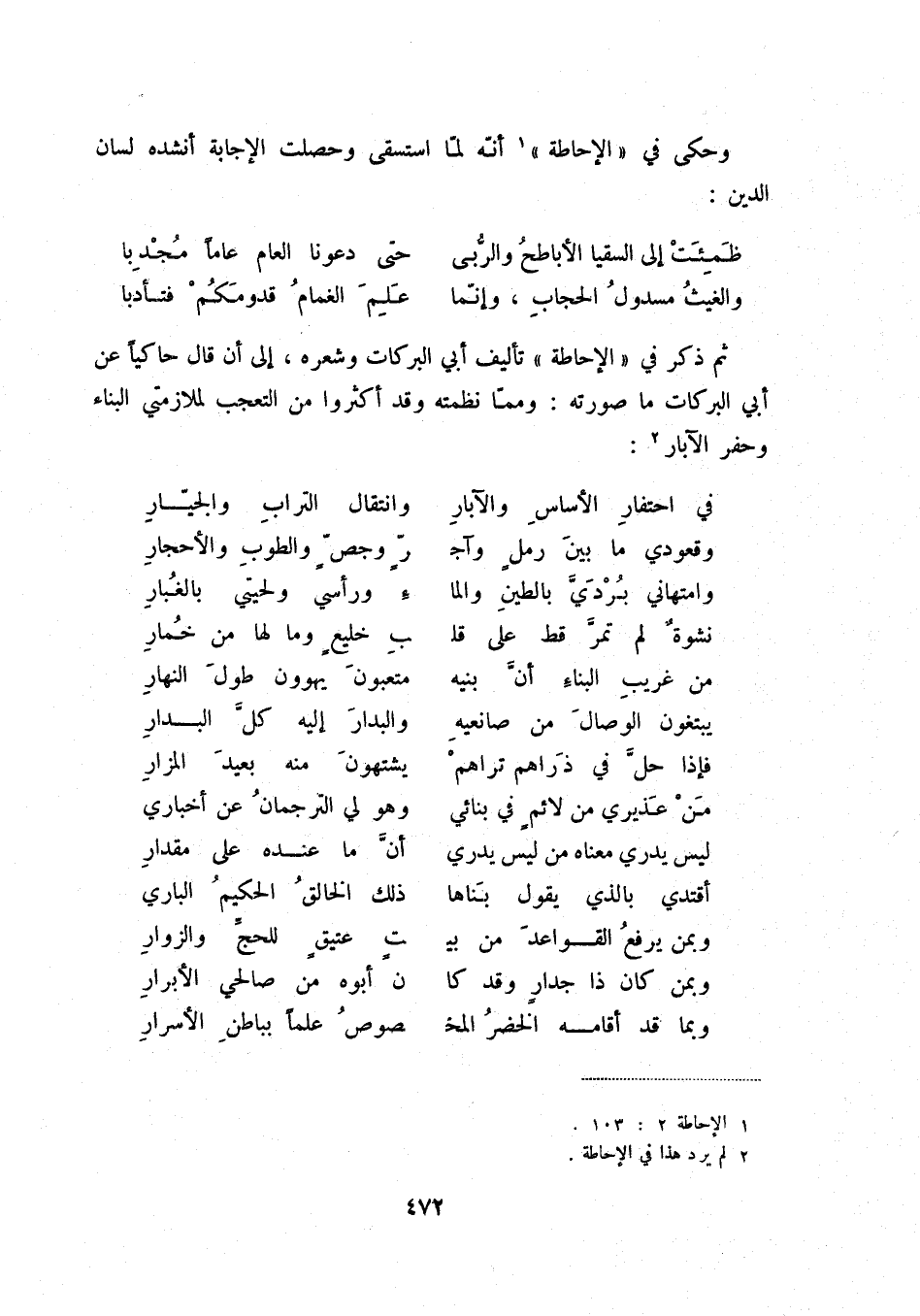 والغيث مسدول الحجاب، وإنما ... علم الغمام قدومكم فتأدب ثم ذكر في الإحاطة تأليف أبي البركات وشعره، إلى أن قال حاكياً عن أبي البركات ما صورته: ومما نظمته وقد أكثروا من التعجب لملازمتي البناء وحفر الآبار (2) :