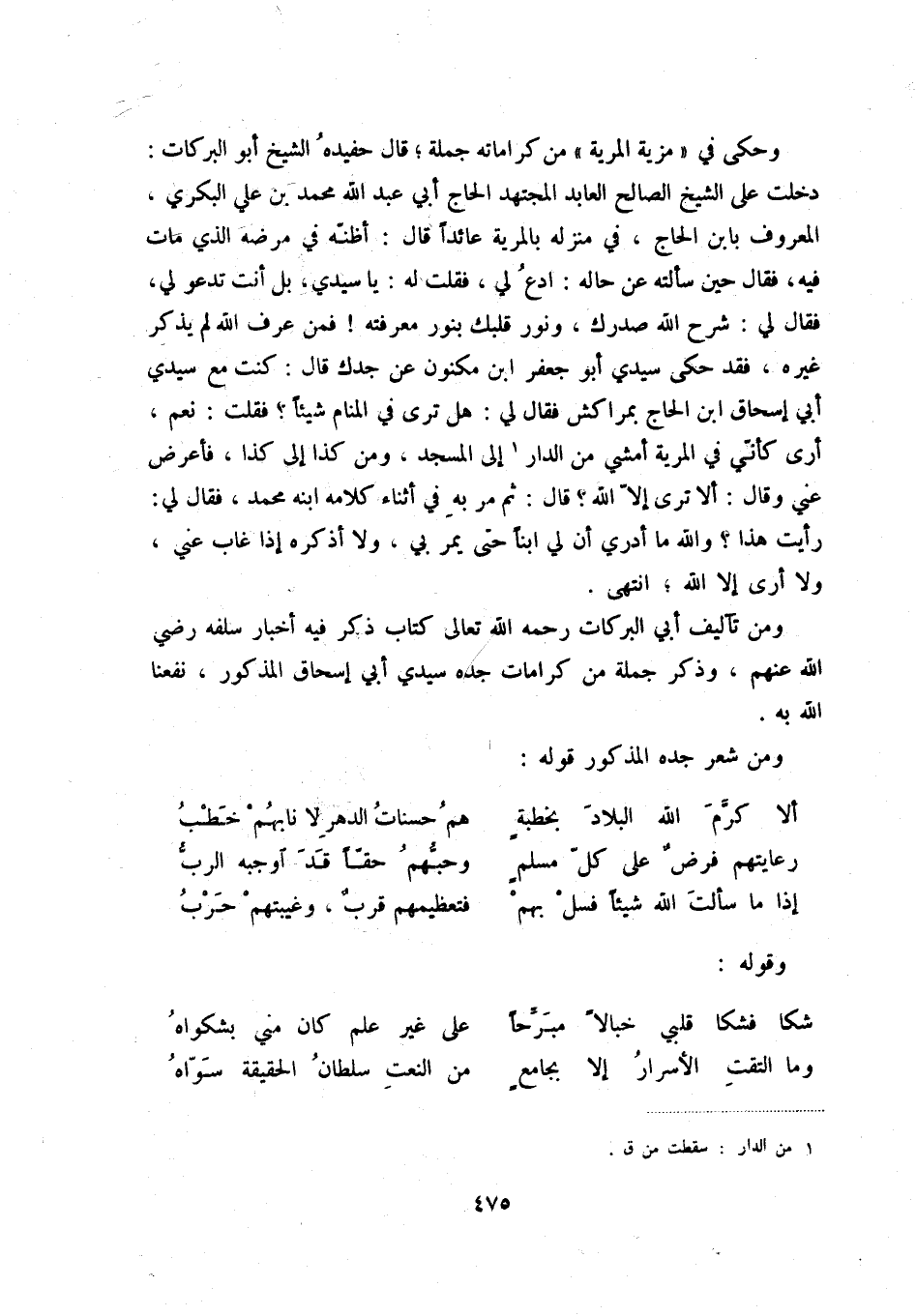 ومن تآليف أبي البركات رحمه الله تعالى كتاب ذكر فيه أخبار سلفه رضي الله عنهم، وذكر جملة من كرامات جده سيدي أبي إسحاق المذكور، نفعنا الله به.