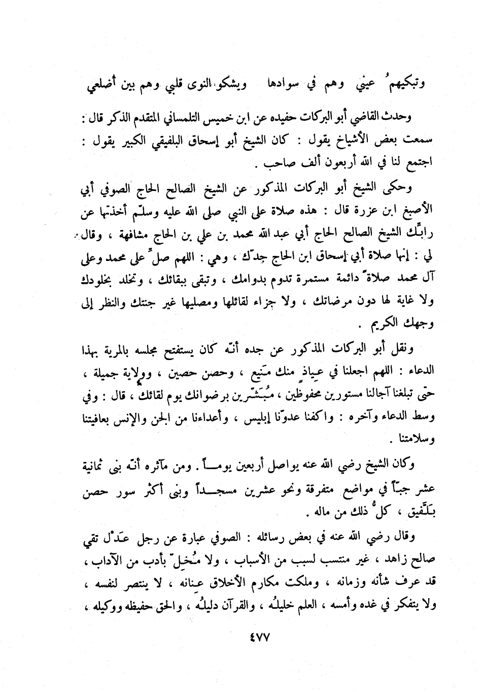 وتبكيهم عني وهم في سوادها ... ويشكو النوى قلبي وهم بين أضلعي وحدث القاضي أبو البركات حفيده عن ابن خميس التلمساني المتقدم الذكر قال: سمعت بعض الأشياخ يقول: كان الشيخ أبو إسحاق البلفيقي الكبير يقول: اجتمع لنا في الله أربعون ألف صاحب.