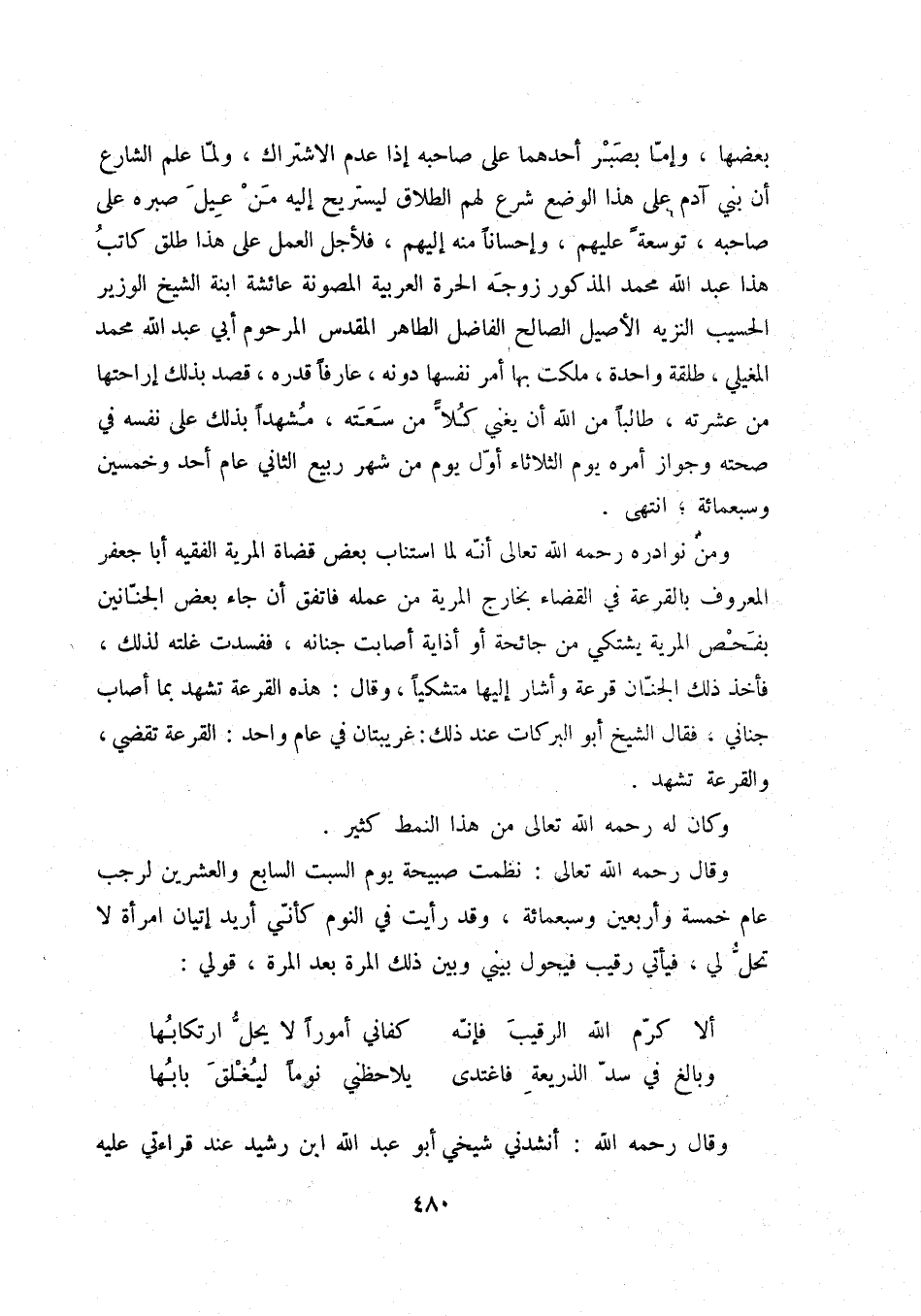 بعضها، وإما بصبر أحدهما على صاحبه إذا عدم الاشتراك، ولما علم الشارع أن بني آدم على هذا الوضع شرع لهم الطلاق ليستريح إليه من عيل صبره على صاحبه، توسعة عليهم، وإحساناً منه إليهم، فلأجل العمل على هذا طلق كاتب هذا عبد الله محمد المذكور زوجه الحرة العربية المصونة عائشة ابنة الشيخ الوزير الحسيب النزيه الأصيل الصالح الفاضل الطاهر المقدس المرحوم أبي عبد الله محمد المغيلي، طلقة واحدة، ملكت بها أمر نفسها دونه، عارفاً قدره قصد بذلك إراحتها من عشرته، طالباً من الله أن يغني كلاً من سعته، مشهداً بذلك على نفسه في صحته وجواز أمره يوم الثلاثاء أول يوم من شهر ربيع الثاني عام أحد وخمسين وسبعمائة؛ انتهى.