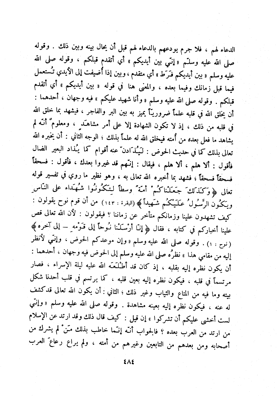 الدعاء لهم، فلا جرم يودعهم بالدعاء لهم قبل أن يحال بينه وبين ذلك، وقوله صلى الله عليه وسلم " إني بين أيديكم " أي أتقدم قبلكم، وقوله صلى الله عليه وسلم " بين أيديكم فرط " أي متقدم، وبين إذا أضيفت إلى الأيدي تستعمل فيما قبل زمانك وفيما بعده، والمعنى هنا في قوله " بين أيديكم " أي أتقدم قبلكم، وقوله صلى الله عليه وسلم " وأنا شهيد عليكم " فيه وجهان، أحدهما: أن يخلق الله في قلبه علماً ضرورياً يميز به بين البر والفاجر، فيشهد بما خلق الله في قلبه من ذلك، إذ لا تكون الشهادة إلا على أمر مشاهد، ومعلوم أنه لم يشاهد ما فعل بعده من أمته فيخلق الله له علماً بذلك، الوجه الثاني: أن يخبره الله تعالى بذلك كما في حديث الحوض: ليذدان عنه أقوام كما يذاد البعير الضال فأقول: ألا هلم، ألا هلم، فيقال: إنهم قد غيروا بعدك، فأقول: فسحقاً فسحقاً فسحقاً، فشهد بما أخبره الله تعالى به، وهو نظير ما روي في تفسير قوله تعالى " وكذلك جعلناكم أمة وسطاً لتكونوا شهداء على الناس ويكون الرسول عليكم شهيداً " من أن قوم نوح يقولون: كيف تشهدون علينا وزمانكم متأخر عن زماننا فيقولون: لأن الله تعالى قص علينا أخباركم في كتابه، فقال " إنا أرسلنا نوحاً إلى قومه - إلى آخره ".