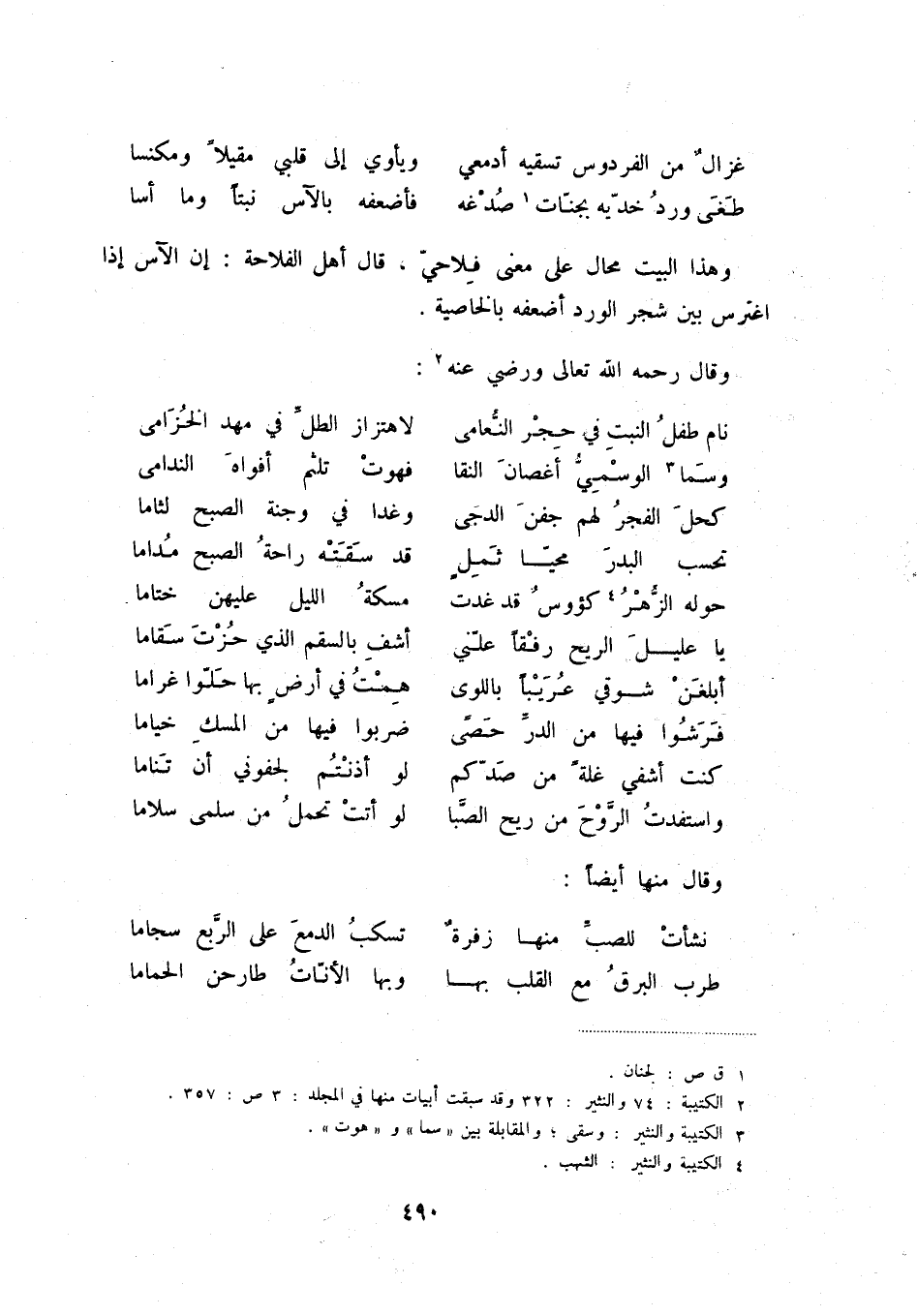 طغى ورد خديه بجنات (1) صدغه ... فأضعفه بالآس نبتاً وما أسا وهذا البيت محال على معنى فلاحي، قال أهل الفلاحة: إن الآس إذا اغترس بين شجر الورد أضعفه بالخاصية.