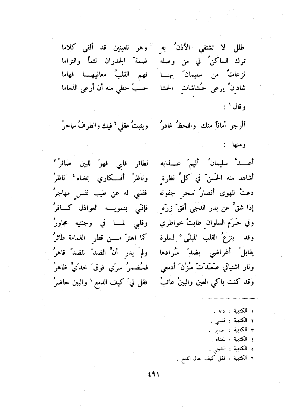 وقد كنت باكي العين والبين غائب ... فقل لي كيف الدمع (6) والبين حاضر