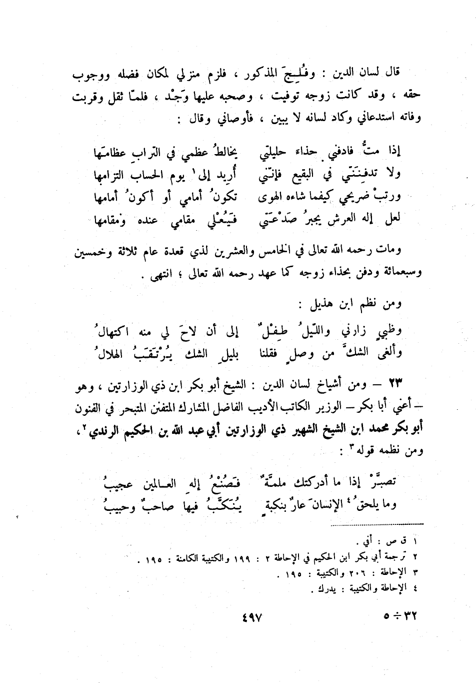 وألغى الشك من وصل فقلنا ... بليل الشك يرتقب الهلال 23 - ومن أشياخ لسان الدين: الشيخ أبو بكر ابن ذي الوزارتين، وهو - أعني أبا بكر - الوزير