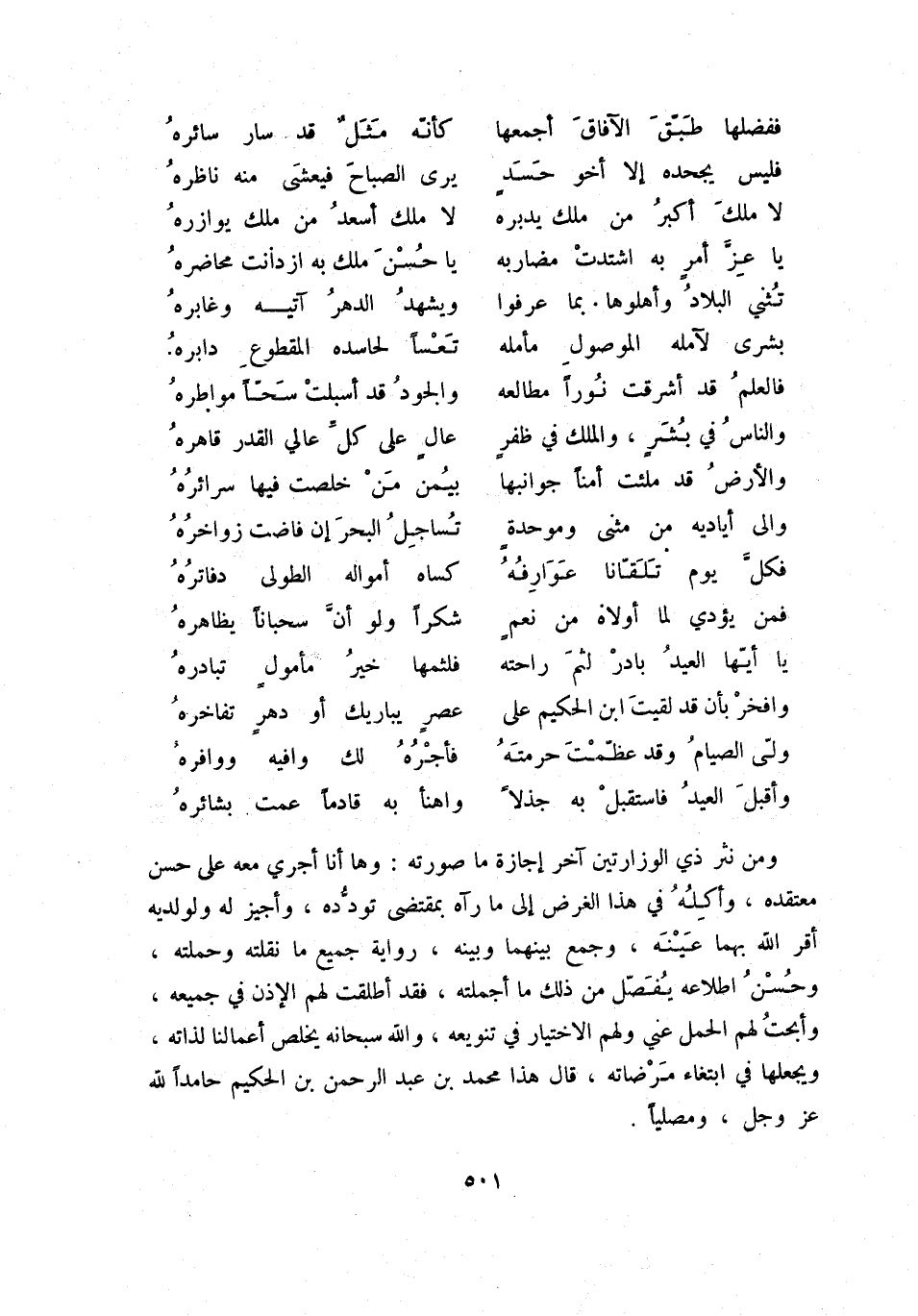 وأقبل العيد فاستقبل به جذلاً ... واهنأ به قادماً عمت بشائره ومن نثر ذي الوزارتين آخر إجازة ما صورته: وها أنا أجري معه على حسن معتقده، إلى ما رآه بمقتضى تودده، وأجيز له ولولديه أقر الله بهما عينه، وجمع بينهما وبينه، رواية جميع ما نقلته وحملته، وحسن اطلاعه يفصل من ذلك ما أجملته، فقد أطلقت لهم الإذن في جميعه، وأبحت لهم الحمل عني ولهم الاختيار في تنويعه، والله سبحانه يخلص أعمالنا لذاته، ويجعلها في ابتغاء مرضاته، قال هذا محمد بن عبد الرحمن بن الحكيم حامداً لله عز وجل، ومصلياً.