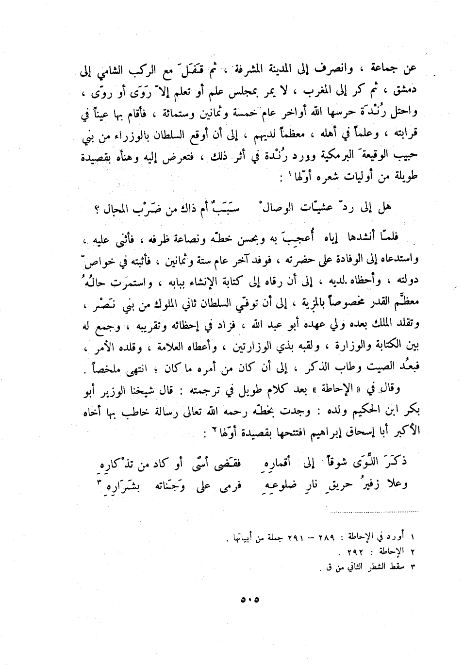 هل إلى رد عشيات الوصال ... سبب أم ذاك من ضرب المجال فلما أنشدها إياه أعجب به وبحسن خطه ونصاعة ظرفه، فأثنى عليه، واستدعاه إلى الوفادة على حضرته، فوفد آخر عام ستة وثمانين، فأثبته في خواص دولته، وأحظاه لديه، إلى أن رقاه إلى كتابة الإنشاء ببابه، واستمرت حاله معظم القدر مخصوصاً بالمزية، إلى أن توفي السلطان ثاني الملوك من بني نصر، وتقلد الملك بعده ولي عهده أبو عبد الله، فزاد في إحظائه وتقريبه، وجمع له بين الكتابة والوزارة، ولقبه بذي الوزارتين، وأعطاه العلامة، وقلده الأمر فبعد الصيت وطاب الذكر، إلى أن كان من أمره ما كان؛ انتهى ملخصاً.