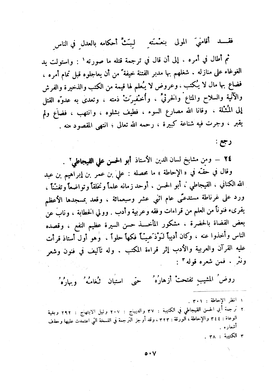 (2) ترجمة أبي الحسن القيجاطي في الكتيبة: 37 والديباج: 207 ونيل الابتهاج: 292 وبغية الوعاة: 344 والإحاطة، الورقة: 323، وقد أوجز الترجمة في النسخة التي اعتمدت عليها وحذف أشعاره.