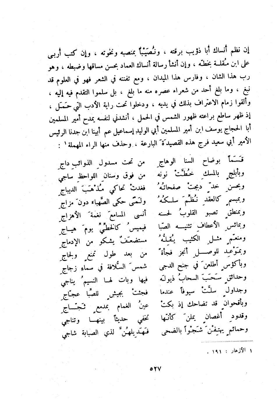 إن نظم أنساك أبا ذؤيب برقته، ونصيباً بمنصبه ونخوته، وإن كتب أربى على ابن مقلة بخطه، وإن أنشأ رسالة أنساك العماد بحسن مساقها وضبطه، وهو رب هذا الشان، وفارس هذا الميدان، ومع تفننه في الشعر فهو في العلوم قد نبغ، وما بلغ أحد من شعراء عصره منه ما بلغ، بل سلموا التقدم فيه إليه، وألقوا زمام الاعتراف بذلك في يديه، ودخلوا تحت راية الأدب التي حمل، إذ ظهر ساطع براعته ظهور الشمس في الحمل، أنشدني لنفسه يمدح أمير المسلمين أبا الحجاج يوسف ابن أمير المسلمين أبا الوليد إسماعيل عم أبينا ابن جدنا الرئيس الأمير أبي سعيد فرج هذه القصيدة البارعة، وحذف منها الراء المهملة (1) :