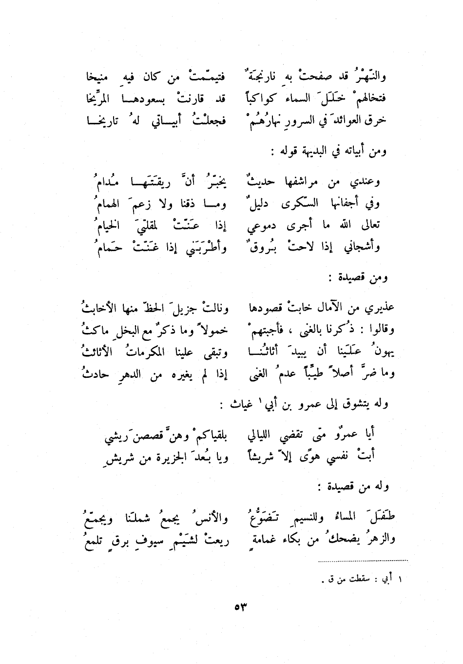 وما ضر أصلاً طيباً عدم الغنى ... إذا لم يغيره من الدهر حادث وله يتشوق إلى عمرو بن أبي (1) غياث: