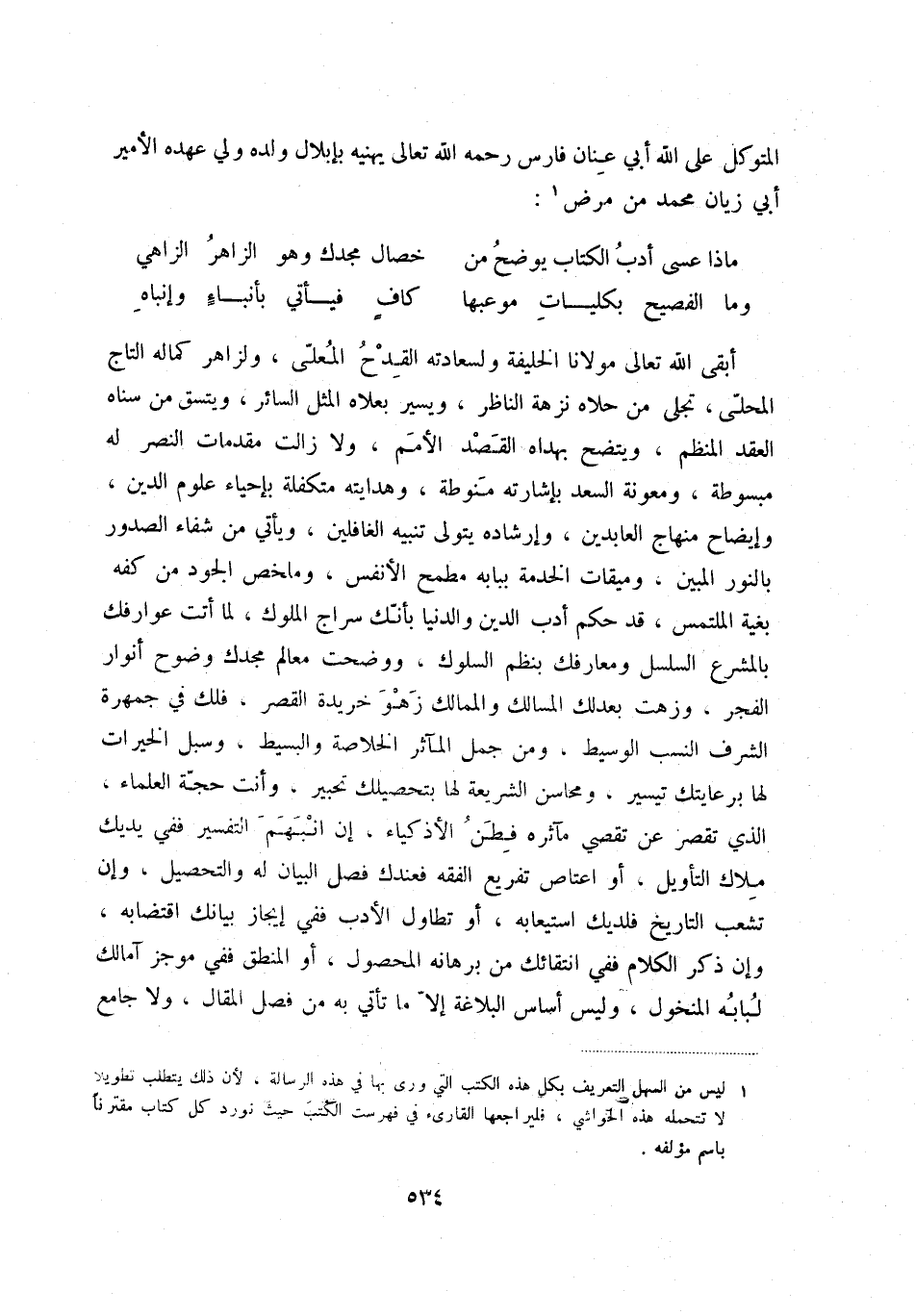 وما الفصيح بكليات موعبها ... كاف فيأتي بأنباء وإنباه أبقى الله تعالى مولانا الخليفة ولسعادته القدح المعلى، ولزاهر كماله التاج المحلى، تجلى من حلاه نزهة الناظر، ويسير بعلاه المثل السائر، ويتسق من سناه العقد المنظم، ويتضح بهداه القصد الأمم، ولا زالت مقدمات النصر له مبسوطة، ومعونة السعد بإشارته منوطة، وهدايته متكفلة بإحياء علوم الدين، وإيضاح منهاج العابدين، وإرشاده يتولى تنبيهى الغافلين، ويأتي من شفاء الصدور بالنور المبين، وميقات الخدمة ببابه مطمح الأنفس، وملخص الجود من كفه بغية الملتمس، قد حكم أدب الدين والدنيا بأنك سراج الملوك، لما أتت عوارفك بالمشرع السلسل ومعارفك بنظم السلوك، ووضحت معالم مجدك وضوح أنوار الفجر، وزهت بعدلك المسالك والممالك زهو خريدة القصر، فلك في جمهرة الشرف النسب الوسيط، ومن جمل المآثر الخلاصة والبسيط، وسبل الخيرات لها برعايتك تيسير، ومحاسن الشريعة بتحصيلك تحبير، وأنت حجة العلماء، الذي تقصر عن تقصي مآثره فطن الأذكياء، إن انبهم التفسير ففي يديك ملاك التأويل، أو اعتاص تفريع الفقه فعندك فصل البيان له والتحصيل، ولإن تشعب التاريخ فلديك استيعابه، أو تطاول الأدب ففي إيجاز بيانك اقتضابه، وإن ذكر الكلام ففي انتقائك من برهانه المحصول، أو المنطق ففي موجز آمالك لبابه المنخول، وليس أساس البلاغة إلا ما تأتي به من فصل المقال، ولا جامع