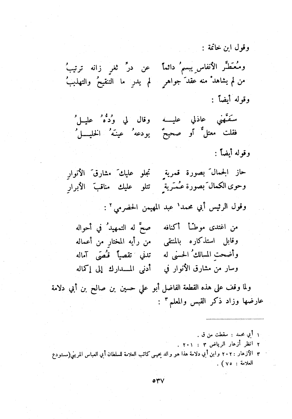 وسار من مشارق الأنوار في ... أدنى المدارك إلى إكماله ولما وقف على هذه القطيعة الفاضل أبو علي حسين بن صالح بن أبي دلامة عارضها وزاد ذكر القبس والمعلم (3) :