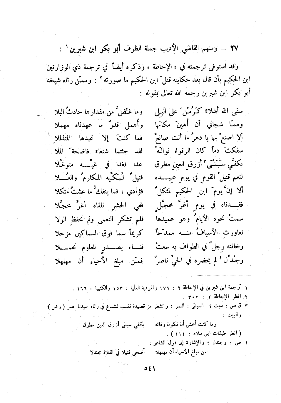 وقد استوفى ترجمته في الإحاطة وذكره أيضاً في ترجمة ذي الوزارتين ابن الحكيم بأن قال بعد حكايته قتل ابن الحكيم ما صورته (2) : وممن رثاه شيخنا أبو بكر ابن شبرين رحمه الله تعالى بقوله: