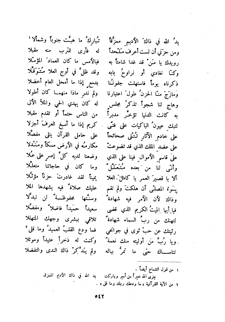 جزى الله خيرا من أمير وباركت ... يد الله في ذاك الأديم الممزق (2) من الآية القرآنية " ما ودعك ربك وما قلى ".