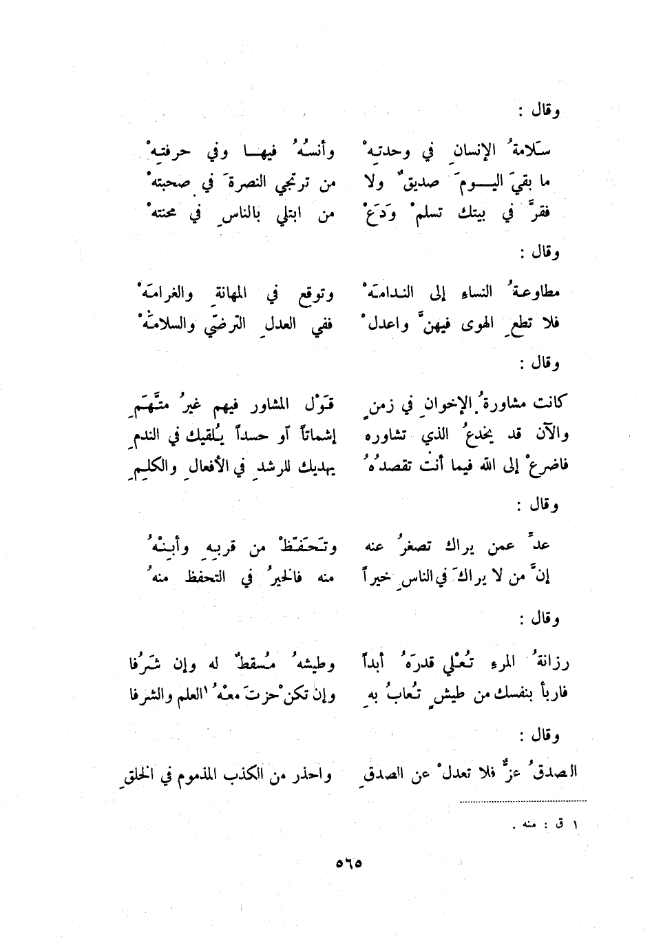 فلا تطع الهوى فيهن واعدل ... ففي العدل الترضي والسلامه وقال: