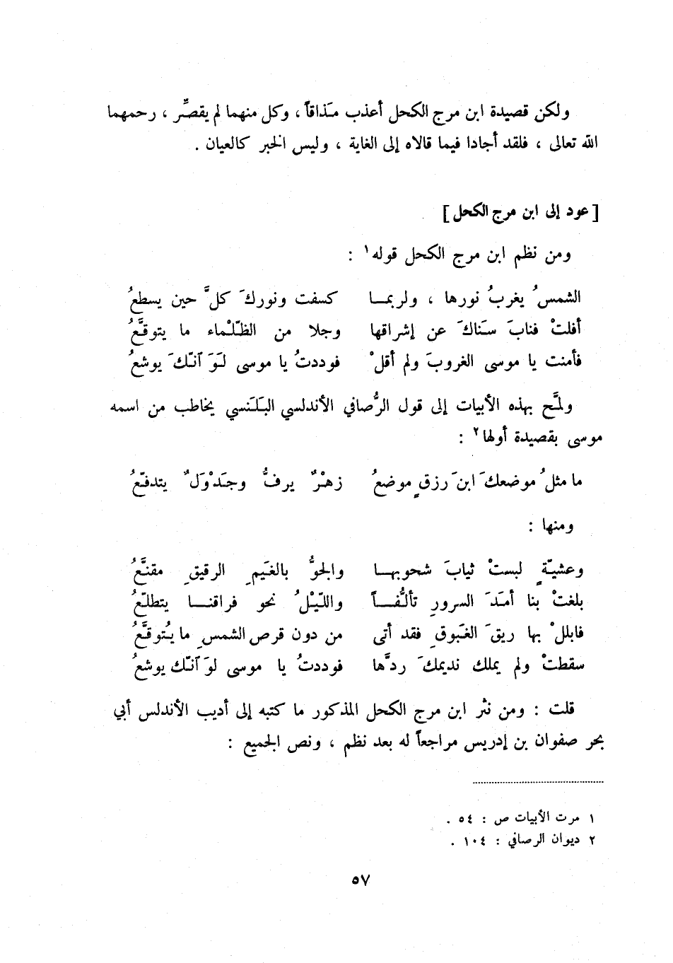 سقطت ولم يملك نديمك ردها ... فوددت يا موسى لو أنك يوشع قلت: ومن نثر ابن مرج الكحل المذكور ما كتبه إلى أديب الأندلس أبي بحر صفوان بن إدريس مراجعاً له بعد نظم، ونص الجميع: