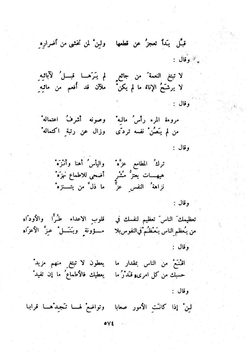 حسبك من كل امرئ قدر ما ... يعطيك فالأطماع ما إن تفيد وقال: