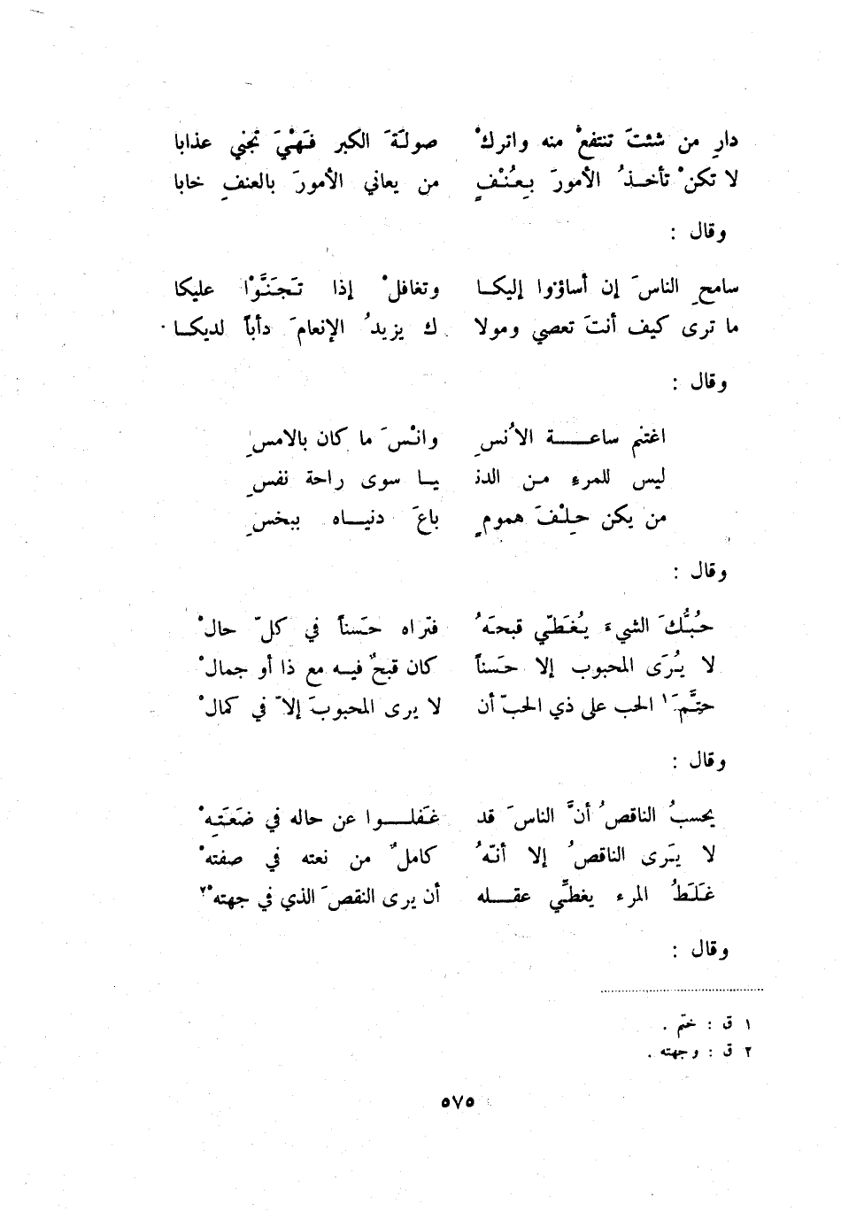 حتم (1) الحب على ذي الحب أن ... لا يرى المحبوب إلا في كمال وقال: