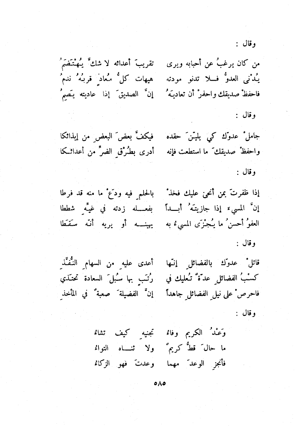 واحفظ صديقك ما استطعت فإنه ... أدرى بطرق الضر من أعدائكا وقال: