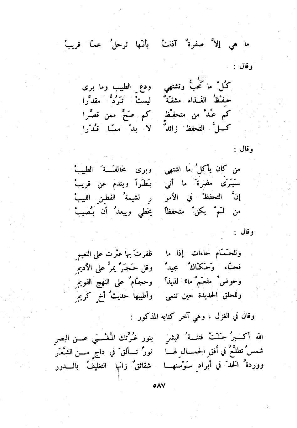 وللحلق الحديدة حين تنمى ... وأطيبها حديث أخ كريم وقال في الغزل، وهي آخر كتابه المذكور: