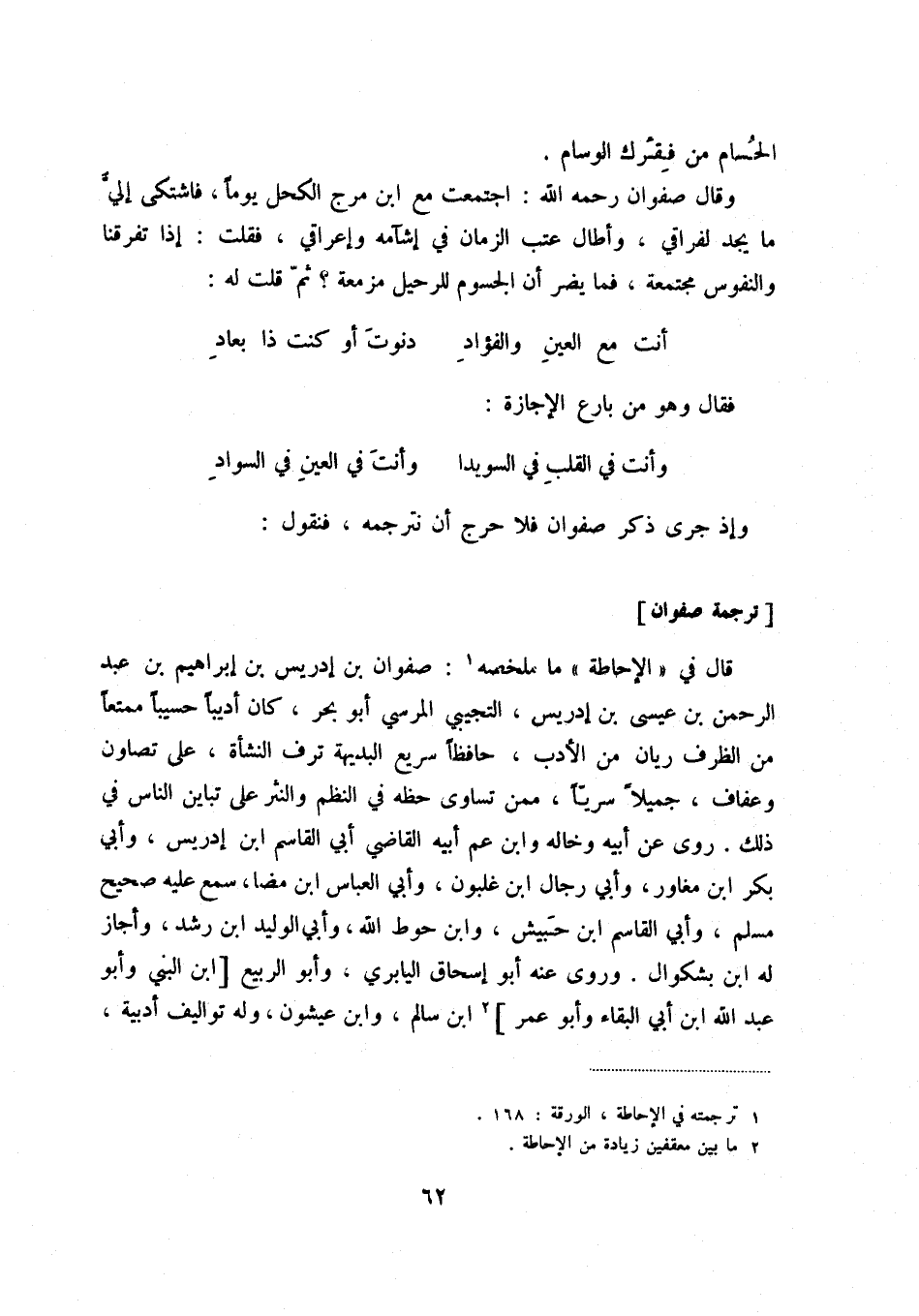وأنت في القلب في السويدا ... وأنت في العين في السواد وإذ جرى ذكر صفوان فلا حرج أن نترجمه، فنقول: