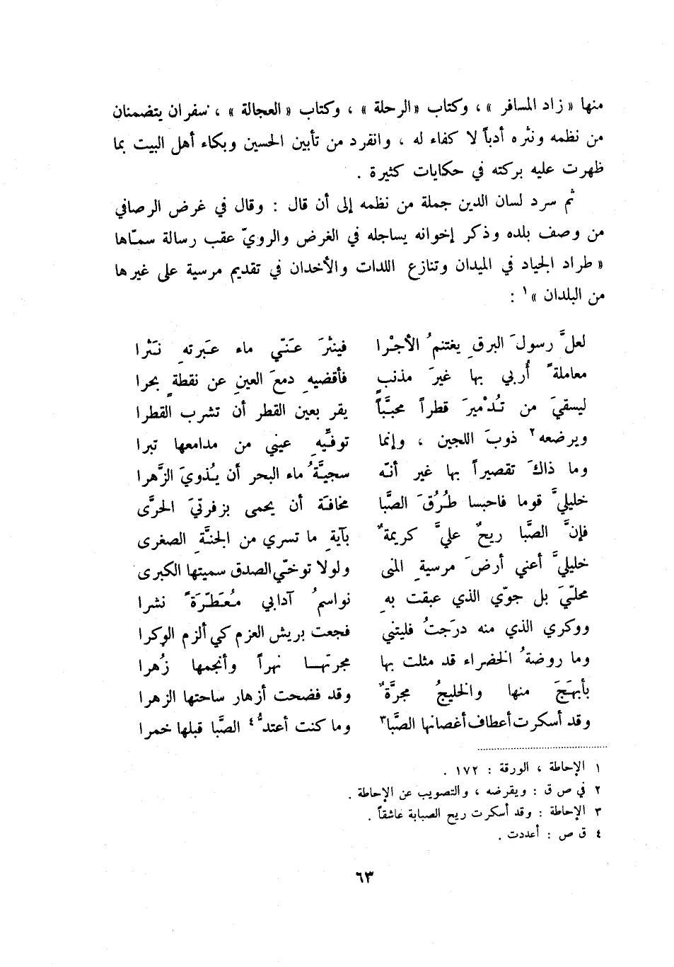 ثم سرد لسان الدين جملة من نظمه إلى أن قال: وقال في غرض الرصافي من وصف بلده وذكر إخوانه يساجله في الغرض والروي عقب رسالة سماها " طراد الجياد في الميدان وتنازع اللدات والأخدان في تقديم مرسية على غيرها من البلدان " (1) :