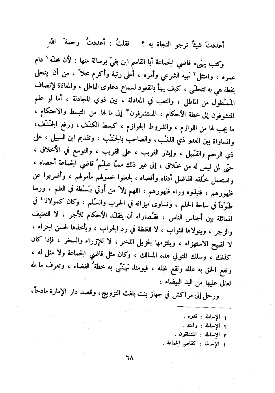 أعددت شيئاً ترجو النجاة به ... فقلت: أعددت رحمة الله وكتب يهنئ قاضي الجماعة أبا القاسم ابن بقي برسالة منها: لأن محله (1) دام عمره، وامتثل (2) نهيه الشرعي وأمره، أعلى رتبة وأكرم محلاً، من أن يتحلى بخطة هي به تتحلى، كيف يهنأ بالقعود لسماع دعاوى الباطل، والمعاناة لإنصاف الممطول من الماطل، والتعب في المعادلة، بين ذوي المجادلة، أما لو علم المتشوفون إلى خطة الأحكام، المستشرفون (3) إلى ما لها من التبسط والاحتكام، ما يجب لها من اللوازم، والشروط الجوازم، كبسط الكنف، ورفع الجنف، والمساواة بين العدو ذي الذنب، والصاحب بالجنب، وتقديم ابن السبيل، على ذي الرحم والقبيل، وإيثار الغريب، على القريب، والتوسع في الأخلاق، حتى لمن ليس له من خلاق، إلى غير ذلك مما علم قاضي الجماعة أحصاه، واستعمل خلقه الفاضل أدناه وأقصاه، لجعلوا خمولهم مأمولهم، وأضربوا عن ظهورهم، فنبذوه وراء ظهورهم، اللهم إلا من أوتي بسطة في العلم، ورسا طوداً في ساحة الحلم، وتساوى ميزانه في الحب والسلم، وكان كمولانا (4) في المماثلة بين أجناس الناس، فقصاراه أن يتقلد الأحكام للأجر، لا للتعنيف والزجر، ويتولاها للثواب، لا للغلظة في رد الجواب، ويأخذها لحسن الجزاء، لا لقبيح الاستهزاء، ويلتزمها لجزيل الذخر، لا للإزراء والسخر، فإذا كان كذلك، وسلك المتولي هذه المسالك، وكان مثل قاضي الجماعة ولا مثل له، ونفع الحق به علله ونقع غلله، فيومئذ تهنى به خطة القضاء، وتعرف ما لله تعالى عليها من اليد البيضاء.
