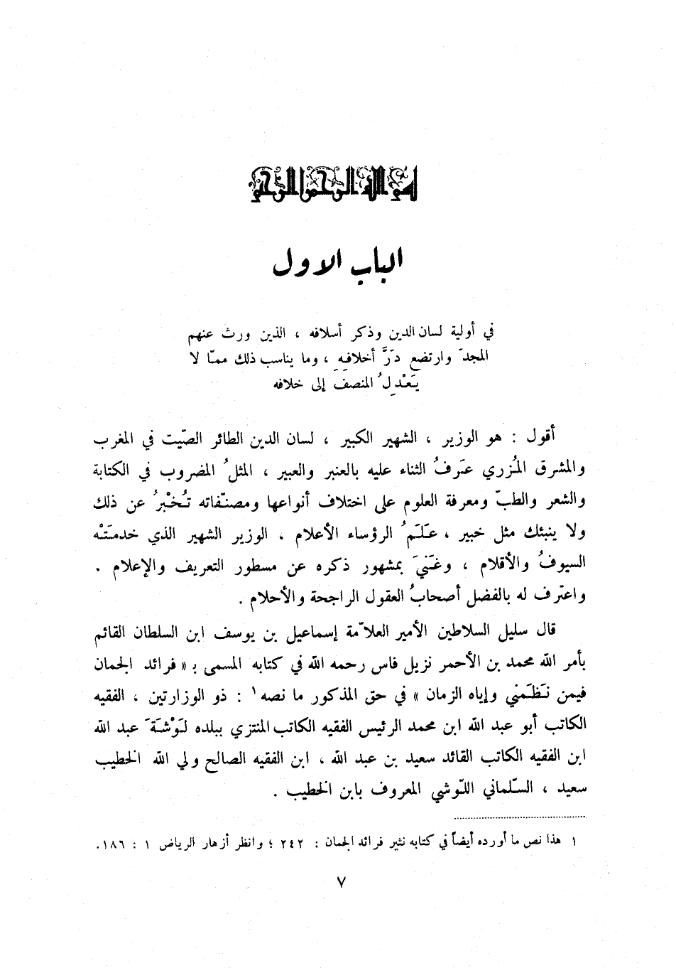 أقول: هو الوزير، الشهير الكبير، لسان الدين الطائر الصيت في المغرب والمشرق المزري عرف الثناء عليه بالعنبر والعبير، المثل المضروب في الكتابة والشعر والطب ومعرفة العلوم على اختلاف أنواعها ومصنفاته تخبر عن ذلك ولا ينبئك مثل خبير، علم الرؤساء الأعلام، الوزير الشهير الذي خدمته السيوف والأقلام، وغني بمشهور ذكره عن مسطور التعريف والإعلام، واعترف له بالفضل أصحاب العقول الراجحة والأحلام.
