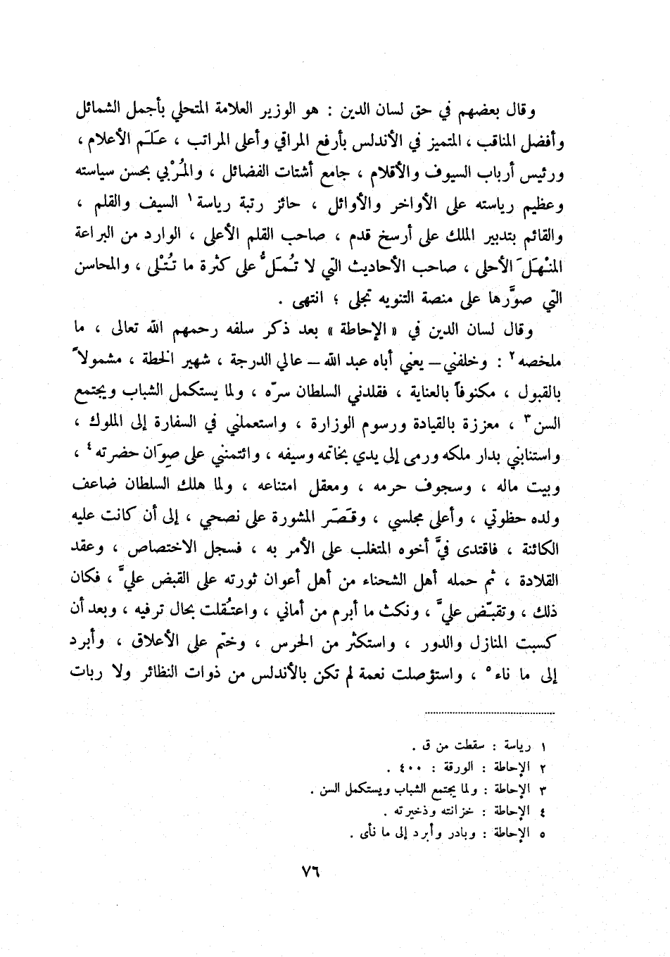 وقال بعضهم في حق لسان الدين: هو الوزير العلامة المتحلي بأجمل الشمائل وأفضل المناقب، المتميز في الأندلس بأرفع المراقي وأعلى المراتب، علم الأعلام، ورئيس أرباب السيوف والأقلام، جامع أشتات الفضائل، والمربي بحسن سياسته وعظيم رياسته على الأواخر والأوائل، حائز رتبة رياسة (1) السيف والقلم، والقائم بتدبير الملك على أرسخ قدم، صاحب القلم الأعلى، الوارد من البراعة المنهل الأحلى، صاحب الأحاديث التي لا تمل على كثرة ما تتلى، والمحاسن التي صورها على منصة التنويه تجلى؛ انتهى.