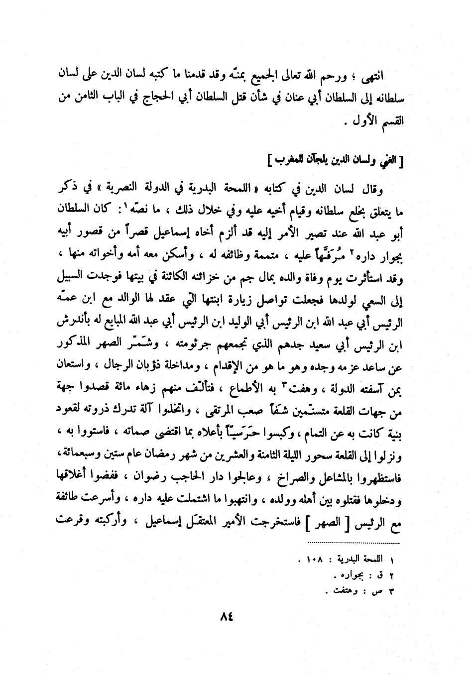 انتهى، ورحم الله تعالى الجميع بمنه وقد قدمنا ما كتبه لسان الدين على لسان سلطانه إلى السلطان أبي عنان في شأن قتل السلطان أبي الحجاج في الباب الثامن من القسم الأول.