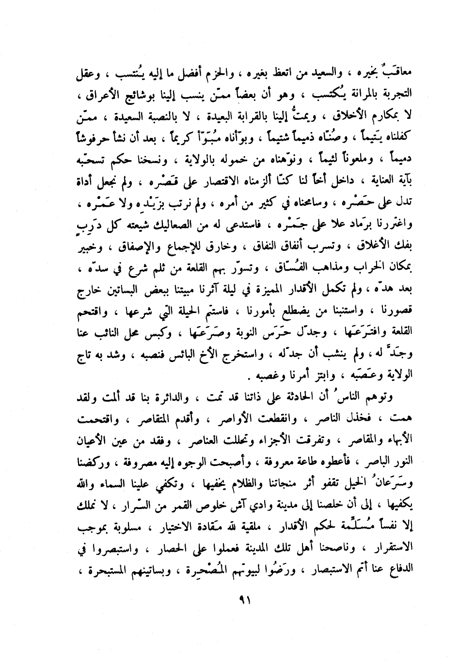 معاقب بخيره، والسعيد من اتعظ بغيره، والحزم أفضل ما إليه ينتسب، وعقل التجربة بالمرانة يكتسب، وهو أن بعضاً مما ينسب إلينا بوشائج الأعراق، لا بمكارم الأخلاق، ويمت إلينا بالقرابة البعيدة، لا بالنصبة السعيدة، ممن كفلناه يتيماً، وصناه ذميماً شتيماً، وبوأناه مبوأ كريماً، بعد أن نشأ حرفوشاً دميماً، وملعوناًً لئيماً، ونوهناه من خموله بالولاية، ونسخنا حكم تسحبه بآية العناية، داخل أخاً لنا كنا ألزمناه الاقتصار على قصره، ولم نجعل أداة تدل على حصره، وسامحناه في كثير من أمره، ولم نرتب بزيده ولا عمره، واغتررنا برماد علا على جمره، فاستدعى له من الصعاليك شيعته كل درب بفك الأغلاق، وتسرب أنفاق النفاق، وخارق للإجماع والإصفاق، وخبير بمكان الخراب ومذاهب الفساق، وتسور بهم القلعة من ثلم شرع في سده، بعد هده، ولم تكمل الأقدار المميزة في ليلة آثرنا مبيتنا ببعض البساتين خارج قصورنا، واستنبنا من يضطلع بأمورنا، فاستتم الحيلة التي شرعها، واقتحم القلعة وافترعها، وجدل حرس النوبة وصرعها، وكبس محل النائب عنا وجد له، ولم ينشب أن جدله، واستخرج الأخ البائس فنصبه، وشد به تاج الولاية وعصبه، وابتز أمرنا وغضبه.