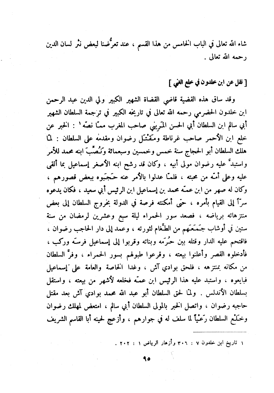 وقد ساق هذه القضية قاضي القضاة الشهير الكبير ولي الدين عبد الرحمن ابن خلدون الحضرمي رحمه الله تعالى في تاريخه الكبير في ترجمة السلطان الشهير أبي سالم ابن السلطان أبي الحسن المريني صاحب المغرب مما نصه (1) : الخبر عن خلع ابن الأحمر صاحب غرناطة ومقتل رضوان ومقدمه على السلطان: لما هلك السلطان أبو الحجاج سنة خمس وخمسين وسبعمائة ونصب ابنه محمد للأمر واستبد عليه رضوان مولى أبيه، وكان قد رشح ابنه الأصغر إسماعيل بما ألقى عليه وعلى أمه من محبته، فلما عدلوا بالأمر عنه حجبوه ببعض قصورهم، وكان له صهر من ابن عمه محمد بن إسماعيل ابن الرئيس أبي سعيد، فكان يدعوه سراً إلى القيام بأمره، حتى أمكنته فرصة في الدولة بخروج السلطان إلى بعض منتزهاته في رياضه، فصعد سور الحمراء ليلة سبع وعشرين لرمضان من سنة ستين في أوشاب جمعهم من الطغام لثورته، وعمد إلى دار الحاجب رضوان، فاقتحم عليه الدار وقتله بين حرمه وبناته وقربوا إلى إسماعيل فرسه وركب، فأدخلوه القصر وأعلنوا بيعته، وقرعوا طبولهم بسور الحمراء، وفر السلطان من مكانه بمنتزهه، فلحق بوادي آش، وغدا الخاصة والعامة على إسماعيل فبايعوه، واستبد عليه هذا الرئيس ابن عمه فخلعه لأشهر من بيعته، واستقل بسلطان الأندلس. ولما لحق السلطان أبو عبد الله محمد بوادي آش بعد مقتل حاجبه رضوان، واتصل الخبر بالمولى السلطان أبي سالم، امتعض لمهلك رضوان وخلع السلطان رعياً لما سلف له في جوارهم، وأزعج لحينه أبا القاسم الشريف