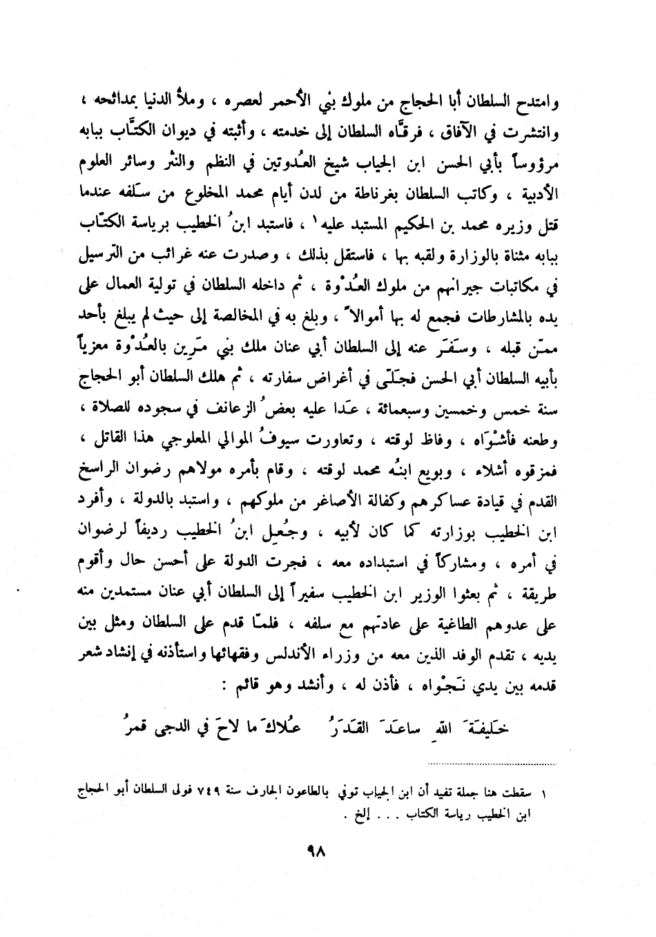 وامتدح السلطان أبا الحجاج من ملوك بني الأحمر لعصره، وملأ الدنيا بمدائحه، وانتشرت في الآفاق، فرقاه السلطان إلى خدمته، وأثبته في ديوان الكتاب ببابه مرؤوساً بأبي الحسن ابن الجياب شيخ العدوتين في النظم والنثر وسائر العلوم الأدبية، وكاتب السلطان بغرناطة من لدن أيام محمد المخلوع من سفله عندما قتل وزيره محمد بن الحكيم المستبد عليه (1) ، فاستبد ابن الخطيب برياسة الكتاب ببابه مثناة بالوزارة ولقبه بها، فاستقل بذلك، وصدرت عنه غرائب من الترسيل في مكاتبات جيرانهم من ملوك العدوة، ثم داخله السلطان في تولية العمال على يده بالمشارطات فجمع له بها أموالاً وبلغ به في المخالصة إلى حيث لم يبلغ بأحد ممن قبله، وسفر عنه إلى السلطان أبي عنان ملك بني مرين بالعدوة معزياً بأبيه السلطان أبي الحسن فجلى في أغراض سفارته، ثم هلك السلطان أبو الحجاج سنة خمس وخمسين وسبعمائة، عدا عليه بعض الزعانف في سجوده للصلاة، وطعنه فأشواه، وفاظ لوقته، وتعاورت سيوف المالي المعلوجي هذا القاتل، فمزقوه أشلاء، وبويع ابن محمد لوقته، وقام بأمره مولاهم رضوان الراسخ القدم في قادة عساكرهم وكفالة الأصاغر من ملوكهم، واستبد بالدولة، وأفرد ابن الخطيب بوزارته كما كان لأبيه، وجعل ابن الخطيب رديفاً لرضوان في أمره، ومشاركاً في استبداده معه، فجرت الدولة على أحسن حال وأقوم طريقة، ثم بعثوا الوزير ابن الخطيب سفيراً إلى السلطان أبي عنان مستمدين منه الطاغية على عاداتهم مع سلفه فلما قدم على السلطان ومثل بين يديه تقدم الوفد الذين معه من وزراء الأندلس وفقهائها واستأذنه في إنشاد شعر قدمه بين يدي نجواه، فأذن له، وأنشد وهو قائم: