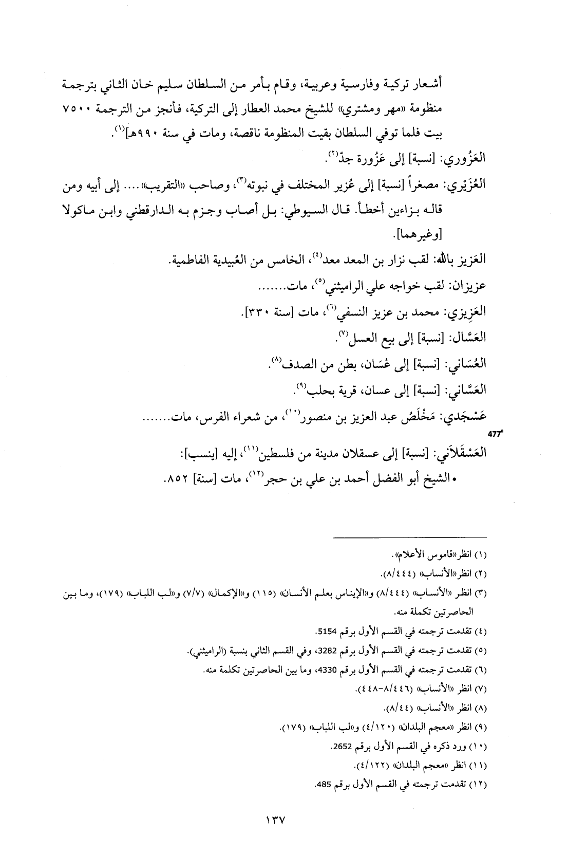 (¬3) انظر "الأنساب" (8/ 444) و"الإيناس بعلم الأنسان" (115) و"الإكمال" (7/ 7) و"لب اللباب" (179)، وما بين الحاصرتين تكملة منه.
