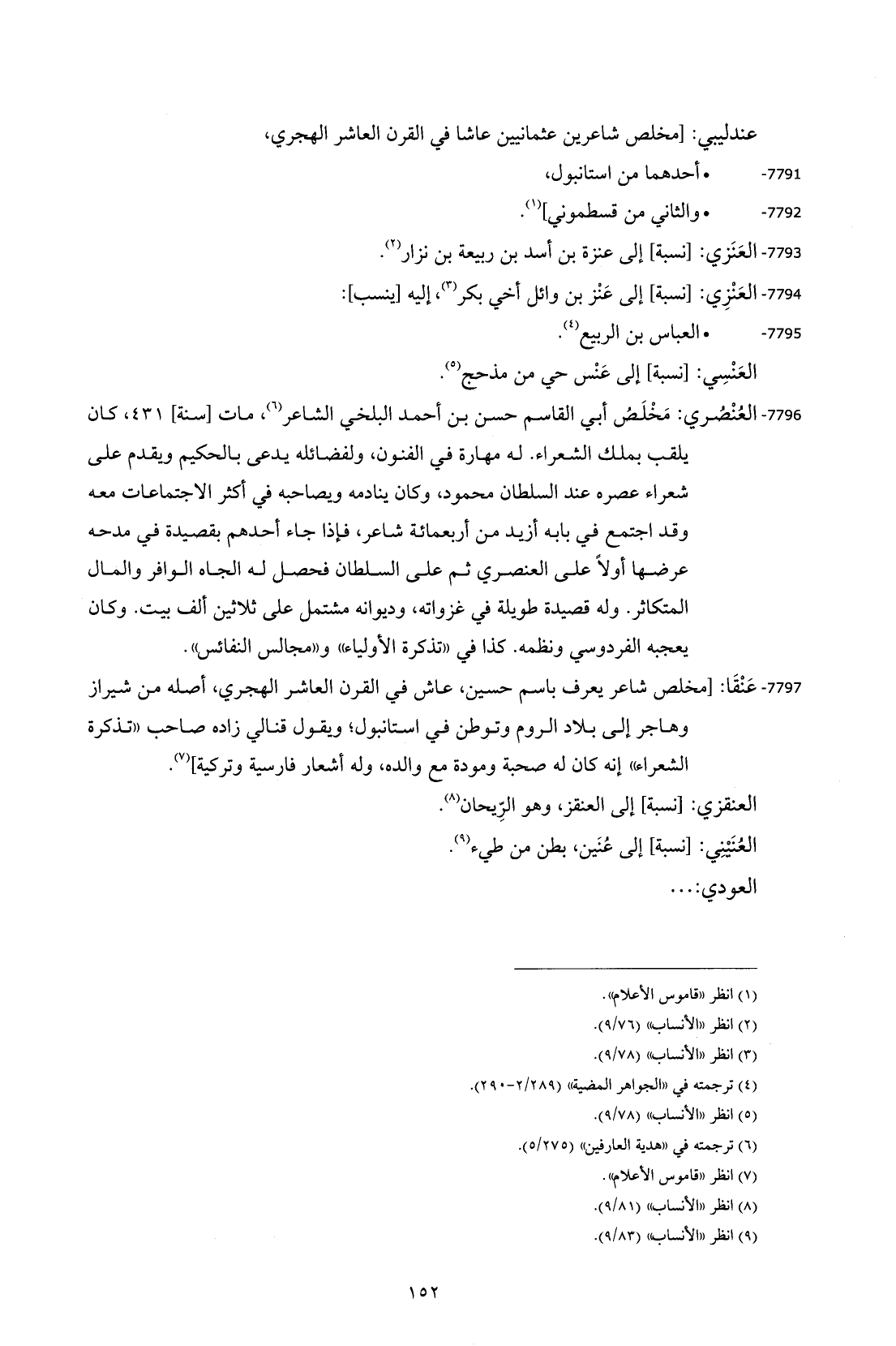 7796 - العُنْصُري: مَخْلَصُ أبي القاسم حسن بن أحمد البلخي الشاعر (¬6)، مات [سنة] 431، كان يلقب بملك الشعراء. له مهارة في الفنون، ولفضائله يدعى بالحكيم ويقدم على شعراء عصره عند السلطان محمود، وكان ينادمه ويصاحبه في أكثر الاجتماعات معه وقد اجتمع في بابه أزيد من أربعمائة شاعر، فإذا جاء أحدهم بقصيدة في مدحه عرضها أولاً على العنصري ثم على السلطان فحصل له الجاه الوافر والمال المتكاثر. وله قصيدة طويلة في غزواته، وديوانه مشتمل على ثلاثين ألف بيت. وكان يعجبه الفردوسي ونظمه. كذا في "تذكرة الأولياء" و"مجالس النفائس".