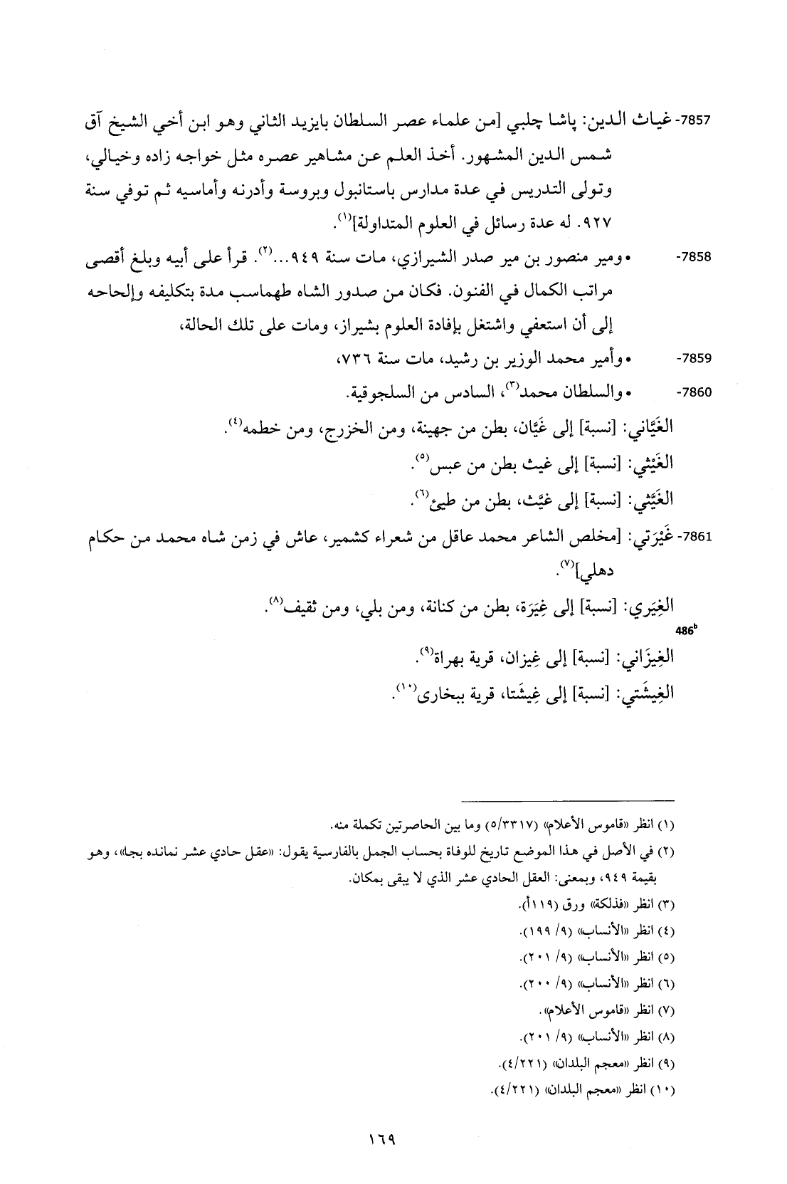7857 - غياث الدين: باشا جلبي [من علماء عصر السلطان بايزيد الثاني وهو ابن أخي الشيخ آق شمس الدين المشهور. أخذ العلم عن مشاهير عصره مثل خواجه زاده وخيالي، وتولى التدريس في عدة مدارس بإستانبول وبروسة وأدرنه وأماسيه ثم توفي سنة 927. له عدة رسائل في العلوم المتداولة] (¬1).