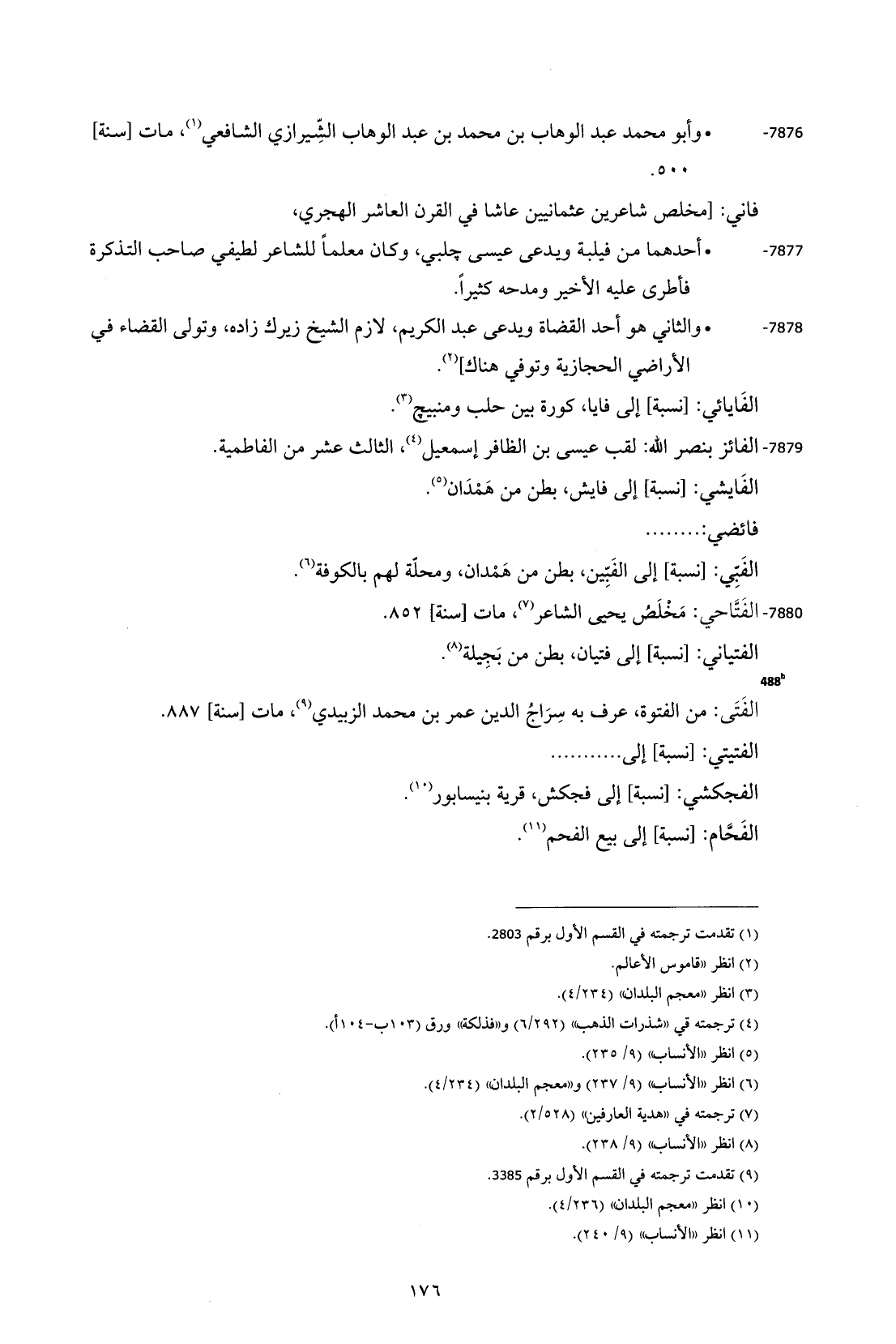 7876 - • وأبو محمد عبد الوهاب بن محمد بن عبد الوهاب الشِّيرازي الشافعي (¬1)، مات [سنة] 500.