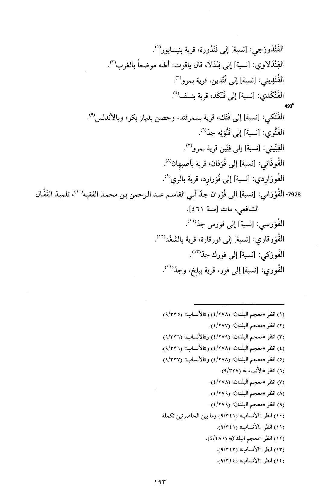 7928 - الفُوْرَاني: [نسبة] إلى فُوْران جدّ أبي القاسم عبد الرحمن بن محمد الفقيه (¬10)، تلميذ القَفَّال الشافعي، مات [سنة 461].