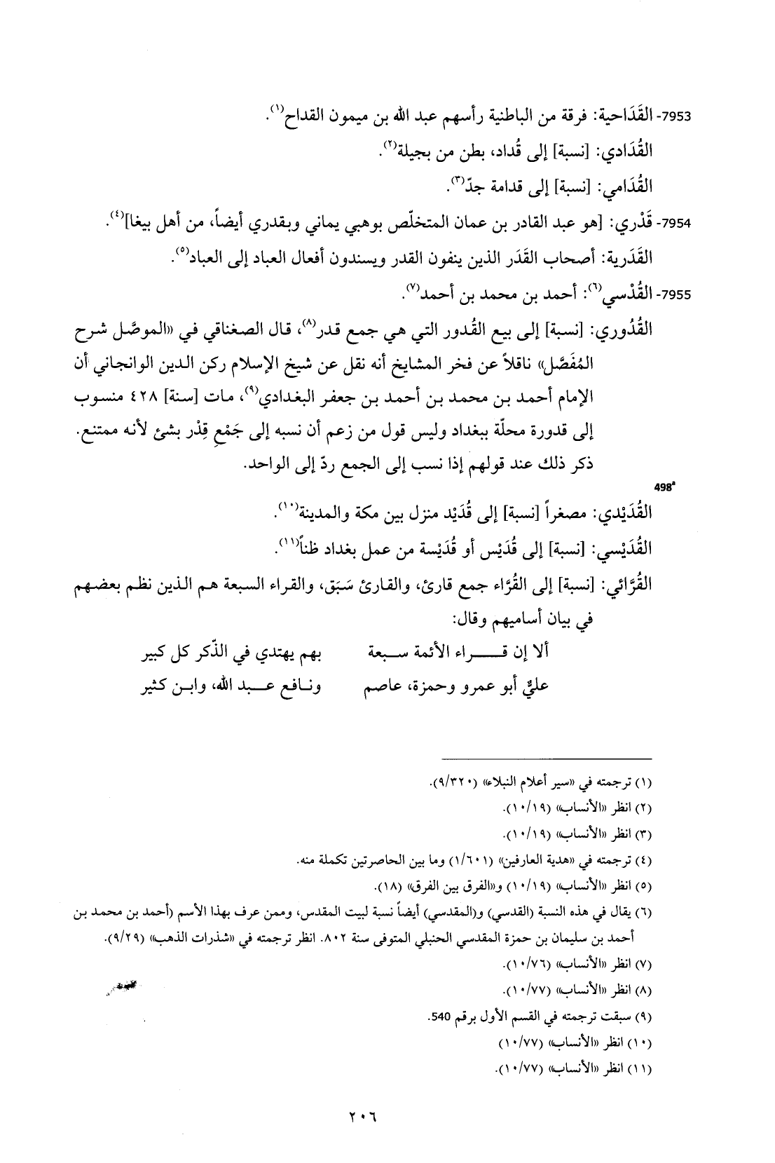 (¬6) يقال في هذه النسبة (القدسي) و (المقدسي) أيضًا نسبة لبيت المقدس، وممن عرف بهذا الاسم (أحمد بن محمد بن أحمد بن سليمان بن حمزة المقدسي الحنبلي المتوفى سنة 802. انظر ترجمته في "شذرات الذهب" (9/ 29).