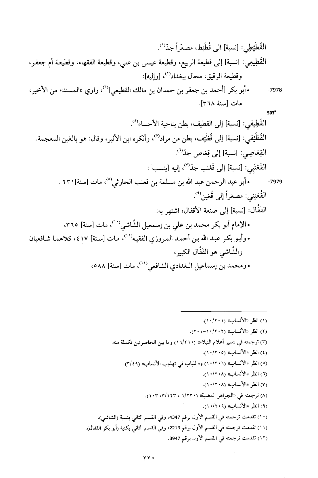 7978 - • أبو بكر [أحمد بن جعفر بن حمدان بن مالك القطيعي] (¬3)، راوي "المسند" من الأخير، مات [سنة 368].