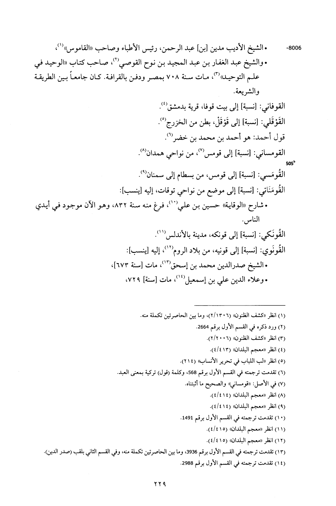 8006 - • الشيخ الأديب مدين [بن] عبد الرحمن، رئيس الأطباء وصاحب "القاموس" (¬1)، . والشيخ عبد الغفار بن عبد المجيد بن نوح القوصي (¬2)، صاحب كتاب "الوحيد في علم التوحيد" (¬3)، مات سنة 708 بمصر ودفن بالقرافة. كان جامعاً بين الطريقة والشريعة.