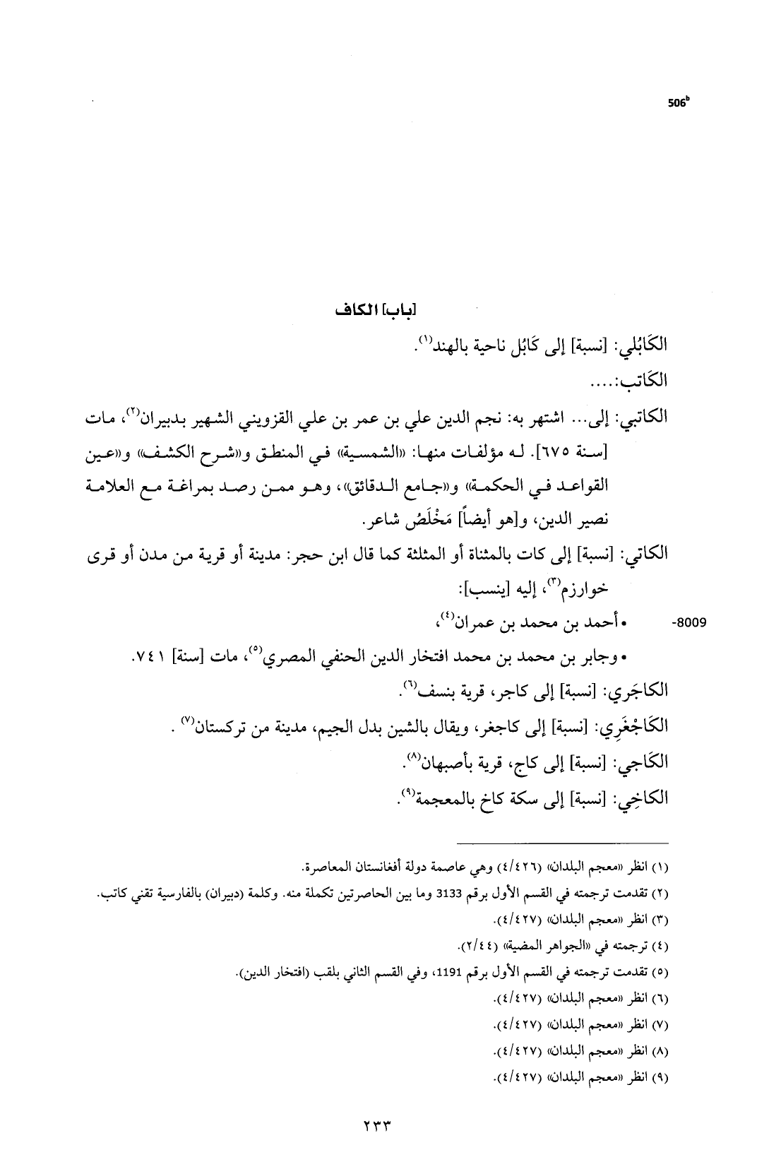 الكاتبي: إلى ... اشتهر به: نجم الدين علي بن عمر بن علي القزويني الشهير بدبيران (¬2)، مات [سنة 675]. له مؤلفات منها: "الشمسية" في المنطق و"شرح الكشف" و"عين القواعد في الحكمة" و"جامع الدقائق"، وهو ممن رصد بمراغة مع العلامة نصير الدين، و [هو أيضًا] مَخْلَصُ شاعر.