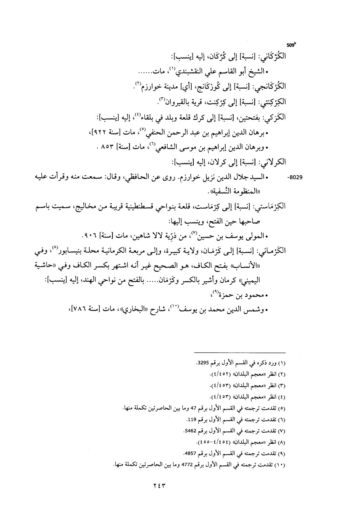 الكَرْماني: [نسبة] إلى كَرْمان، ولاية كبيرة، وإلى مربعة الكرمانية محلة بنيسابور (¬8)، وفي "الأنساب" بفتح الكاف، هو الصحيح غير أنه اشتهر بكسر الكاف وفي "حاشية اليميني" كرمان وأشير بالكسر وكَرْمان ..... بالفتح من نواحي الهند، إليه [ينسب]: