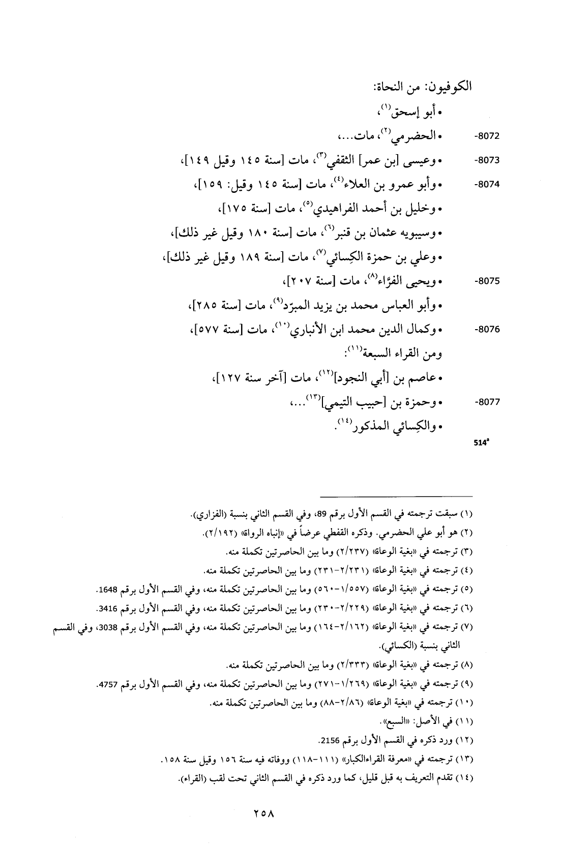 (¬7) ترجمته في "بغية الوعاة" (2/ 162 - 164) وما بين الحاصرتين تكملة منه، وفي القسم الأول برقم 3038، وفي القسم الثاني بنسبة (الكسائي).