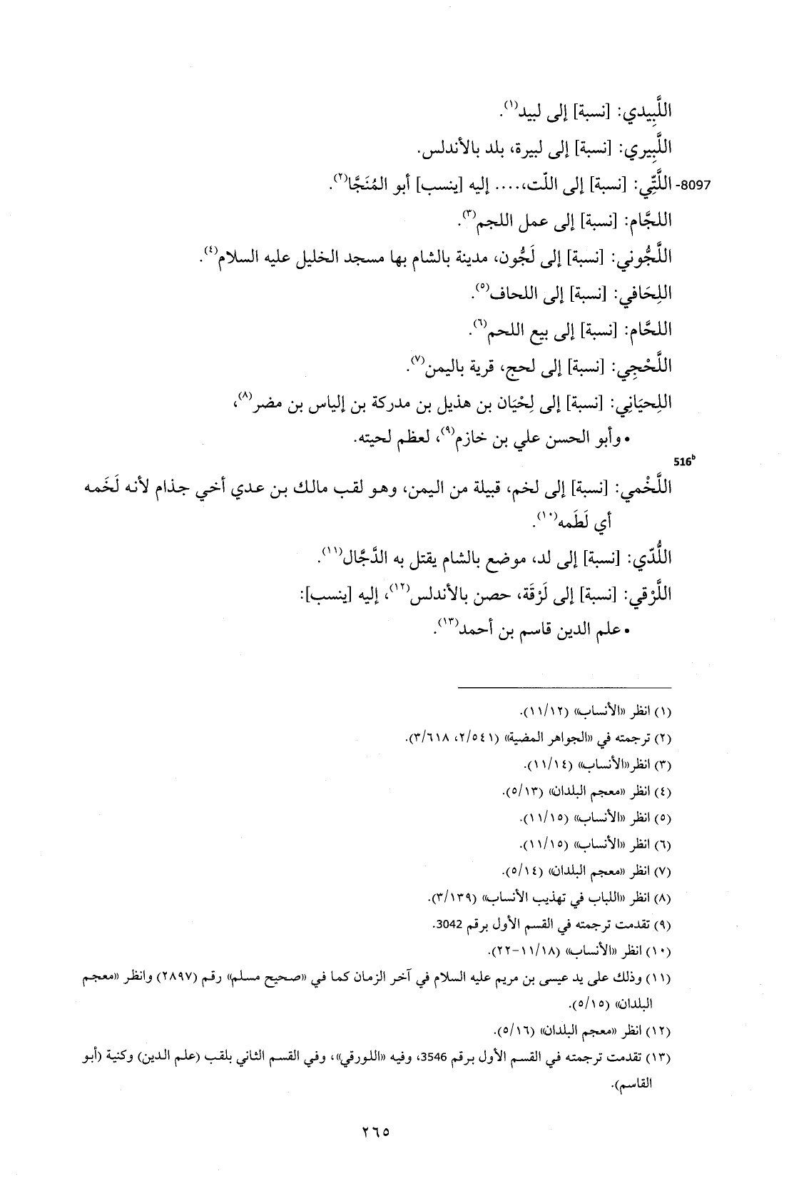 8097 - اللَّتِّي: [نسبة] إلى اللّت، .... إليه [ينسب] أبو المُنَجًا (¬2).