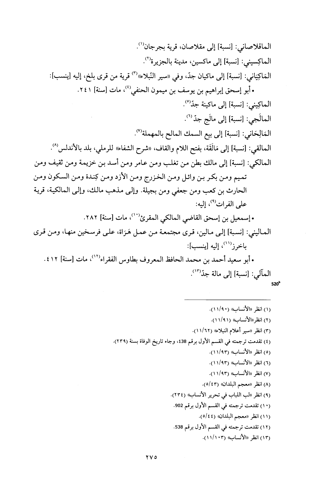 المالكي: [نسبة] إلى مالك بطن من تغلب ومن عامر ومن أسد بن خزيمة ومن ثقيف ومن تميم ومن بكر بن وائل ومن الخزرج ومن الأزد ومن كِندة ومن السكون ومن الحارث بن كعب ومن جعفي ومن بجيلة. وإلى مذهب مالك، وإلى المالكية، قرية على الفرات (¬9)، إليه:
