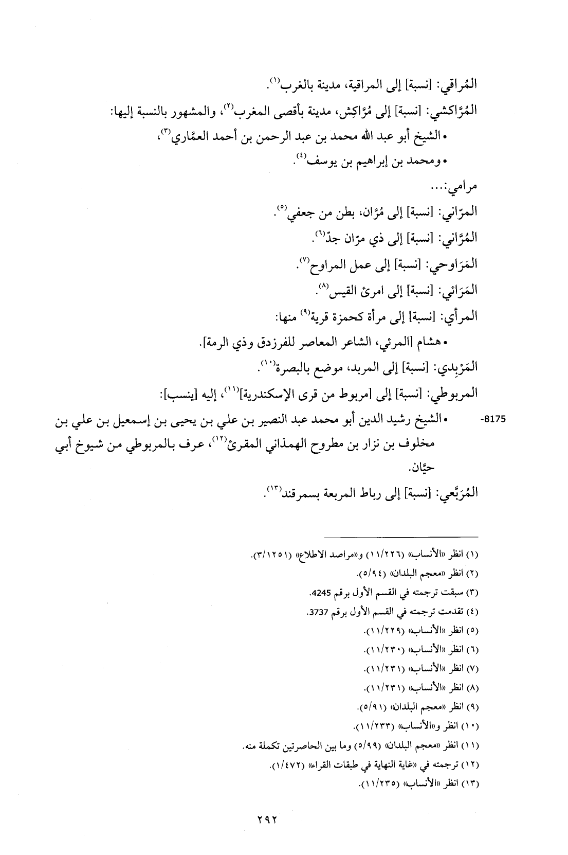 8175 - • الشيخ رشيد الدين أبو محمد عبد النصير بن علي بن يحيى بن إسمعيل بن علي بن مخلوف بن نزار بن مطروح الهمذاني المقرئ (¬12)، عرف بالمربوطي من شيوخ أبي حيان.